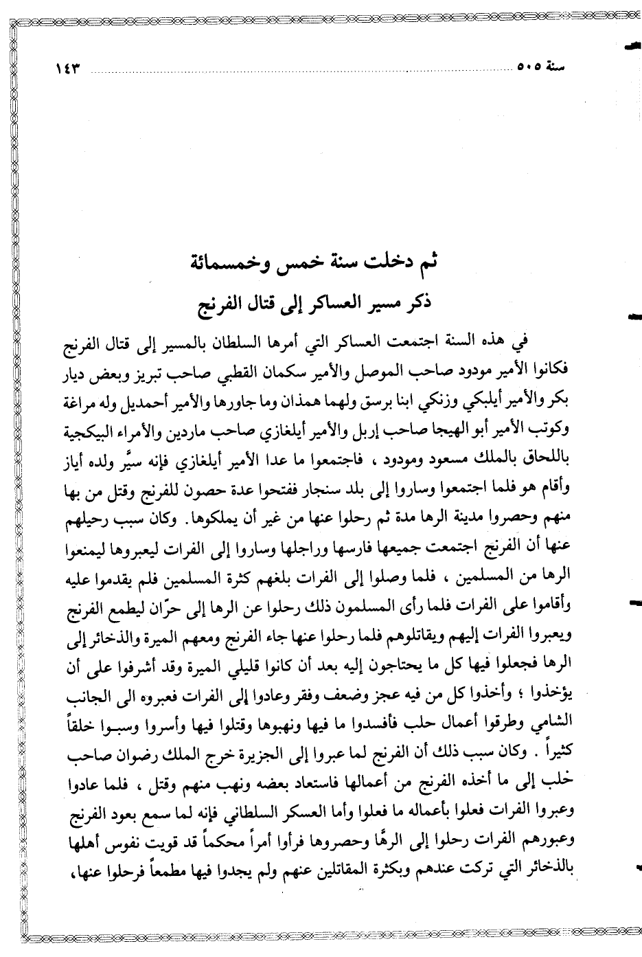 في هذه السنة اجتمعت العساكر التي أمرها السلطان بالمسير إلى قتال الفرنج فكانوا الأمير مودود صاحب الموصل والأمير سكمان القطبي صاحب تبريز وبعض ديار بكر والأمير أيلبكي وزنكي ابنا برسق ولهما همذان وما جاورها والأمير أحمديل وله مراغة وكوتب الأمير أبو الهيجا صاحب إربل والأمير أيلغازي صاحب ماردين والأمراء البيكجية باللحاق بالملك مسعود ومودود فاجتمعوا ما عدا الأمير أيلغازي فإنه سير ولده أياز وأقام هو فلما اجتمعوا وساروا إلى بلده سنجار ففتحوا عدة حصون للفرنج وقتل من بها منهم وحصروا مدينة الرها مدة ثم رحلوا عنها من غير أن يملكوها