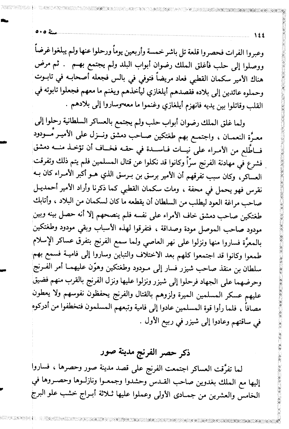 لما تفرقت العساكر اجتمعت الفرنج على قصد مدينة صور وحصرها فساروا إليها مع الملك بغدوين صاحب اللقدس وحشدوا وجمعوا ونازلوها وحصروها فساروا إليها مع الملك بغدوين صاحب القدس وحشدوا وجمعوا ونازلوها وحصروها في الخامس والعشرين من جمادى الأولى وعملوا عليها ثلاثة أبراج علو البرج
