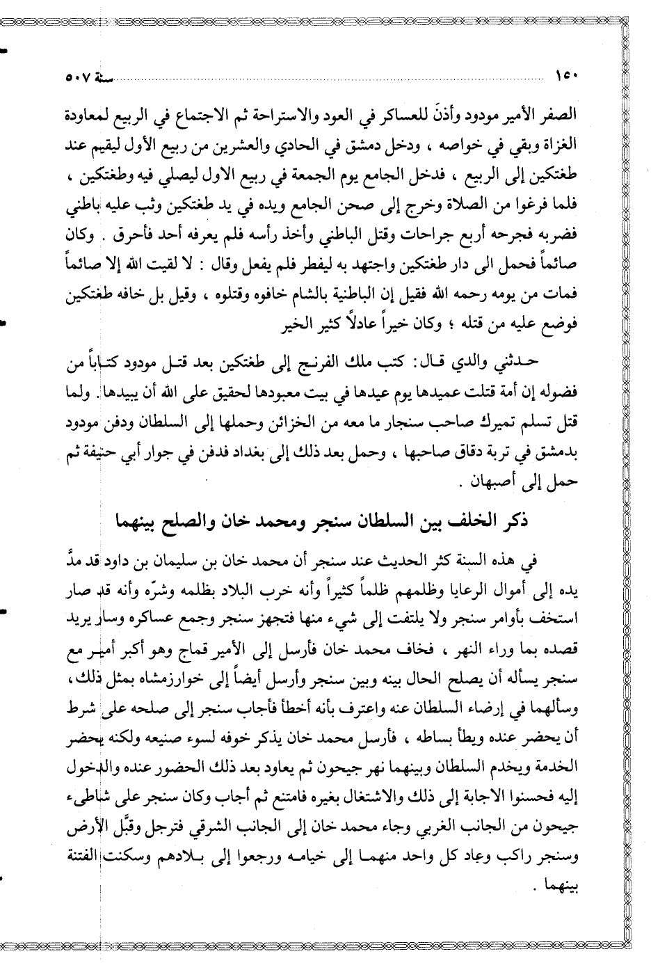 الصفر الأمير مودود وأذن للعساكر في العود والاستراحة ثم الاجتماع في الربيع لمعاودة الغزاة وبقي في خواصه ودخل دمشق في الحادي والعشرين من ربيع الأول ليقيم عند طغتكين إلى الربيع فدخل الجامع يوم الجمعة في ربيع الأول ليصلي فيه وطغتكين فلما فرغوا من الصلاة وخرج إلى صحن الجامع ويده في يد طغتكين وثب عليه باطني فضربه فجرحه أربع جراحات وقتل الباطني وأخذ رأسه فلم يعرف أحد فأحرق