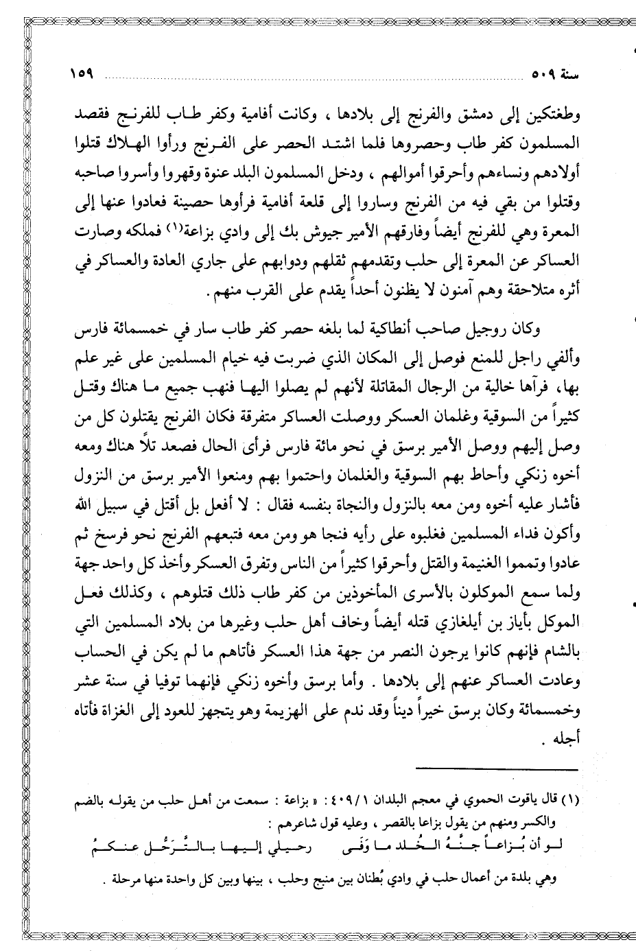 وطغتكين إلى دمشق والفرنج إلى بلادها وكانت أفامية وكفر طاب للفرنج فقصد المسلمون كفر طاب وحصروها فلما اشتد الحصر على الفرنج ورأوا الهلاك قتلوا أولادهم ونساءهم وأحرقوا أموالهم ودخل المسلمون البلد عنوة وقهروا وأسروا صاحبه وقتلوا من بقي فيه من الفرنج وساروا إلى قلعة أفامية فرأوها حصينة فعادوا عنها إلى المعرة وهي للفرنج أيضا وفارقهم الأمير جيوش بك إلى وادي بزاعة فملكه وصارت العساكر عن المعرة إلى حلب وتقدمهم ثقلهم ودوابهم على جاري العادة والعساكر في أثره متلاحقة وهم آمنون لا يظنون أحدا يقدم على القرب منهم