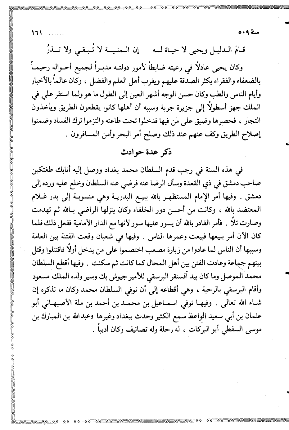 وفيها أمر الإمام المستظهر بالله ببيع البدرية وهي منسوبة إلى بدر غلام المعتضد بالله وكانت من أحسن دور الخلفاء وكان ينزلها الراضي بالله ثم تهدمت وصارت تلا
