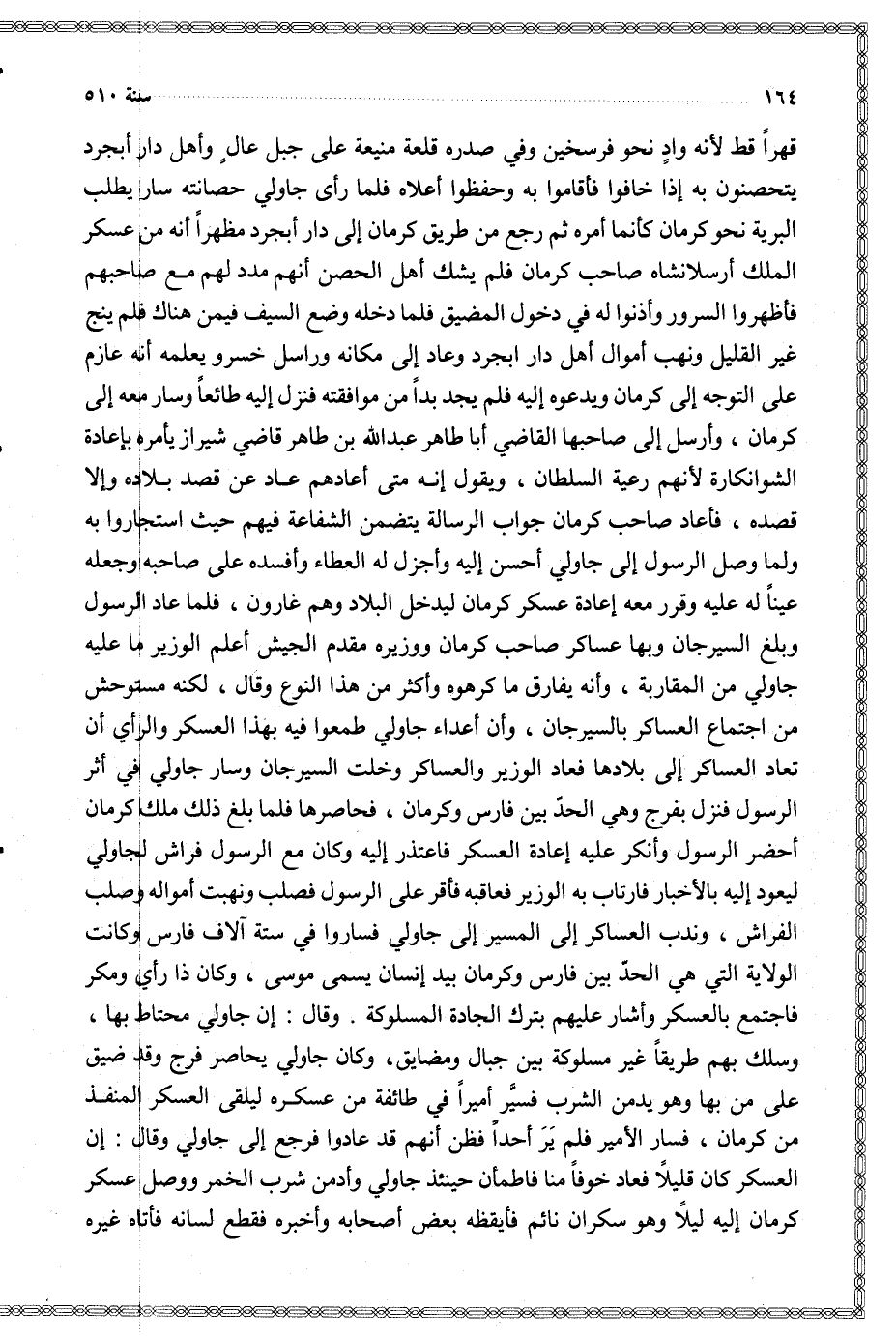 قهرا قط لأنه واد نحو فرسخين وفي صدره قلعة منيعة على جبل عال وأهل دار أبجرد يتحصنون به إذا خافوا فأقاموا به وحفظوا أعلاه فلما رأى جاولي حصانته سار يطلب البرية نحو كرمان كأنما أمره ثم رجع من طريق كرمان إلى دار أبجرد مظهرا أنه من عسكر الملك أرسلانشاه صاحب كرمان فلم يشك أهل الحصن أنهم مدد لهم مع صاحبهم فأظهروا السرور وأذنوا له في دخول المضيق فلما دخله وضع السيف فيمن هناك فلم ينج غير القليل ونهب أموال أهل دار ابجرد وعاد إلى مكانه وراسل خسروا يعلمه أنه عازم على التوجه إلى كرمان ويدعوه إليه فلم يجد بدا من موافقته فنزل إليه طائعا وسار معه إلى كرمان وأرسل إلى صاحبها القاضي أبا طاهر عبد الله بن طاهر قاضي شيراز يأمره بإعادة الشوانكارة لأنهم رعية السلطان ويقول إنه متى أعادهم عاد عن قصد بلاده وإلا قصده فأعاد صاحب كرمان جواب الرسالة يتضمن الشفاعة فيهم حيث استجاروا به ولما وصل الرسول إلى جاولي أحسن إليه وأجزل له العطاء وأفسده على صاحبه وجعله عينا له عليه وقرر معه إعادة عسكر كرمان ليدخل البلاد وهم غارون فلما عاد الرسول وبلغ السيرجان وبها عساكر صاحب كرمان ووزيره مقدم الجيش أعلم الوزير ما عليه جاولي من المقاربة وأنه لا يفارق ما كرهوه وأكثر من هذا النوع وقال لكنه مستوحش من اجتماع العساكر بالسيرجان وأن أعداء جاولي طمعوا فيه بهذا العسكر والرأي أن تعاد العساكر إلى بلادها فعاد الوزير والعساكر وخلت السيرجان وسار جاولي في أثر الرسول فنزل بفرج وهي الحد بين فارس وكرمان فحاصرها فلما بلغ ذلك ملك كرمان أحضر الرسول وأنكر عليه إعادة العسكر فاعتذر إليه وكان مع الرسول فراش لجاولي ليعود إليه بالأخبار فارتاب به الوزير فعاقبه فأقر على الرسول فصلب ونهبت أمواله وصلب الفراش وندب العساكر إلى المسير إلى جاولي فساروا في ستة آلاف فارس وكانت الولاية التي هي الحد بين فارس وكرمان بيد إنسان يسمى موسى وكان ذا رأي ومكر فاجتمع بالعسكر وأشار عليهم بترك الجادة المسلوكة