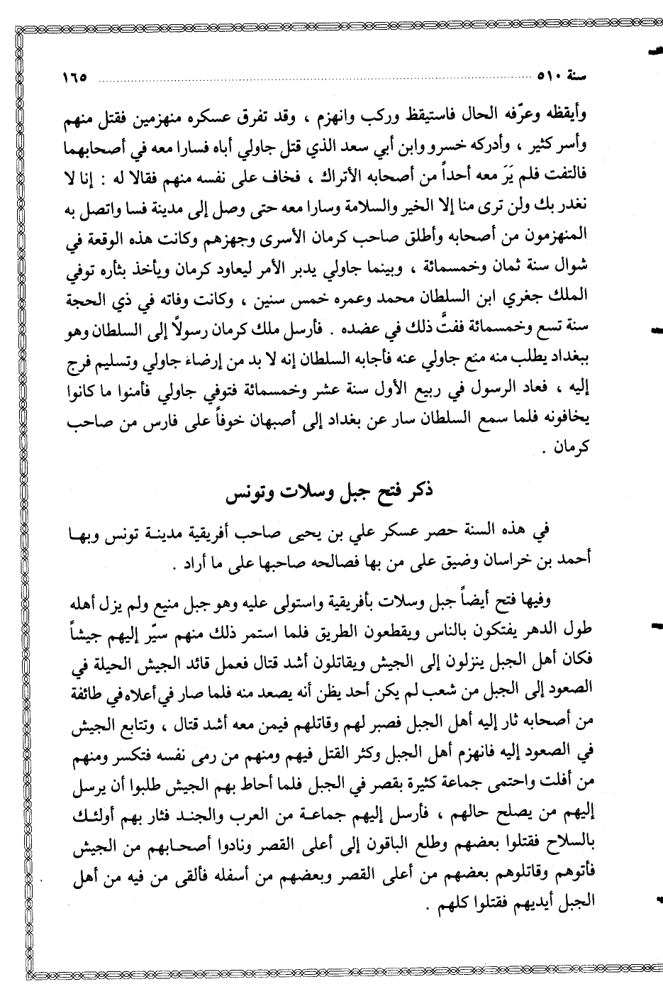 وفيها فتح أيضا جبل وسلات بإفريقية واستولى عليه وهو جبل منيع ولم يزل أهله طول الدهر يفتكون بالناس ويقطعون الطريق فلما استمر ذلك منهم سير إليهم جيشا فكان أهل الجبل ينزلون إلى الجيش ويقاتلون أشد قتال فعمل قائد الجيش الحيلة في الصعود إلى الجبل من شعب لم يكن أحد يظن أنه يصعد منه فلما صار في أعلاه في طائفة من أصحابه ثار إليه أهل الجبل فصبر لهم وقاتلهم فيمن معه أشد قتال وتتابع الجيش في الصعود إليه فانهزم أهل الجبل وكثر القتل فيهم ومنهم من رمى نفسه فتكسر ومنهم من أفلت واحتمى جماعة كثيرة بقصر في الجبل فلما أحاط بهم الجيش طلبوا أن يرسل إليهم من يصلح حالهم فأرسل إليهم جماعة من العرب والجند فثار بهم أولئك بالسلاح فقتلوا بعضهم وطلع الباقون إلى أعلى القصر ونادوا أصحابهم من الجيش فأتوهم وقاتلوهم بعضهم من أعلى القصر وبعضهم من أسفله فألقى من فيه من أهل الجبل أيديهم فقتلوا كلهم