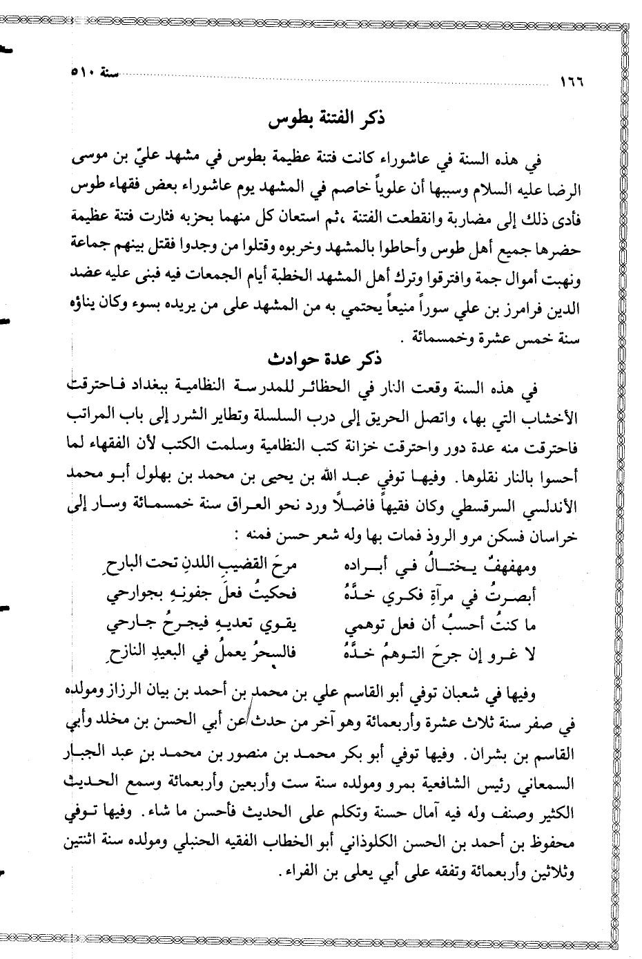 في هذه السنة في عاشوراء كانت فتنة عظيمة بطوس في مشهد علي بن موسى الرضا عليه السلام وسببها أن علويا خاصم في المشهد يوم عاشوراء بعض فقهاء طوس فأدى ذلك إلى مضاربة وانقطعت الفتنة ثم استعان كل منهما بحزبه فثارت فتنة عظيمة حضرها جميع أهل طوس وأحاطوا بالمشهد وخربوه وقتلوا من وجدوا فقتل بينهم جماعة ونهبت أموال جمة وافترقوا وترك أهل المشهد الخطبة أيام الجمعات فيه فبنى عليه عضد الدين فرامرز بن علي سورا منيعا يحتمي به من المسهد على من يريده بسوء وكان بناؤه سنة خمس عشرة وخمسمائة