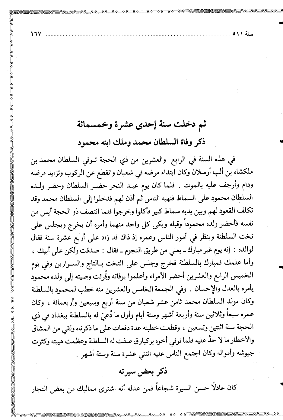 في هذه السنة في الرابع والعشرين من ذي الحجة توفي السلطان محمد ملكشاه بن ألب أرسلان وكان ابتداء مرضه في شعبان وانقطع عن الركوب وتزايد مرضه ودام وأرجف عليه بالموت