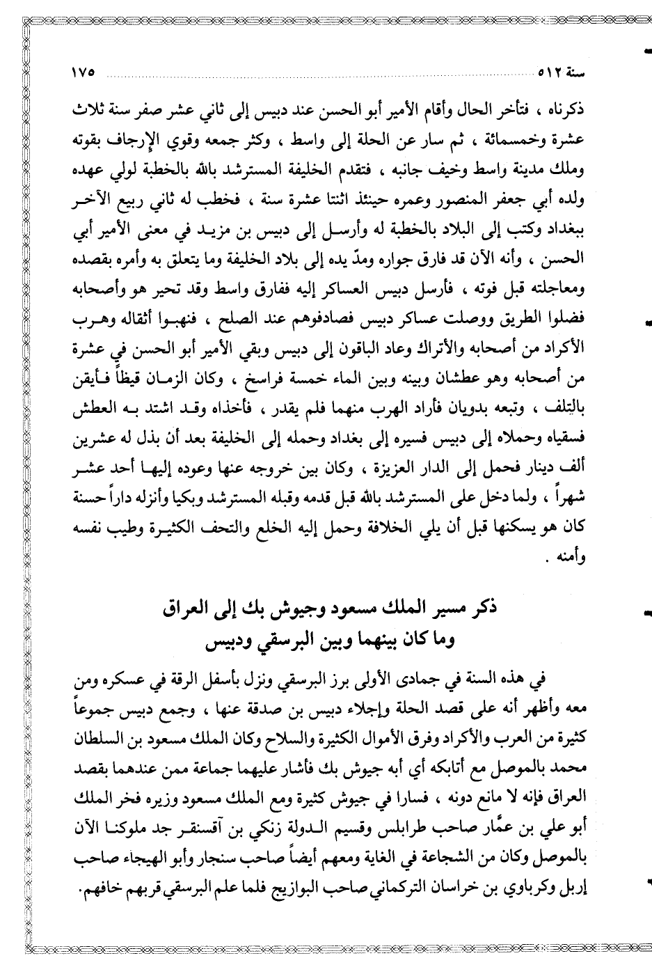 - ذكرناه فتأخر الحال وأقام الأمير أبو الحسن عند دبيس إلى ثاني عشر صفر سنة ثلاث عشرة وخمسمائة ثم سار عن الحلة إلى واسط وكثر جمعه وقوي الإرجاف بقوته وملك مدينة واسط وخيف جانبه فتقدم الخليفة المسترشد بالله بالخطبة لولي عهده ولده أبي جعفر المنصور وعمره حينئذ اثنتا عشرة سنة فخطب له ثاني ربيع الآخر ببغداد وكتب إلى البلاد بالخطبة له وأرسل إلى دبيس من مزيد في معنى الأمير أبي الحسن وأنه الآن قد فارق جواره ومد يده إلى بلاد الخليفة وما يتعلق به وأمره بقصده ومعاجلته قبل فوته فأرسل دبيس العساكر إليه ففارق واسط وقد تحير هو وأصحابه فضلوا الطريق ووصلت عساكر دبيس فصادفوهم عند الصلح فنهبوا أثقاله وهرب الأكراد من أصحابه والأتراك وعاد الباقون إلى دبيس وبقي الأمير أبو الحسن في عشرة من أصحابه وهو عطشان وبينه وبين الماء خمسة فراسخ وكان الزمان قيظا فأيقن بالتلف وتبعه بدويان فأراد الهرب منهما فلم يقدر فأخذاه وقد اشتد به العطش فسقياه وحملاه إلى دبيس فسيره إلى بغداد وحمله إلى الخليفة بعد أن بذل له عشرين ألف دينار فحمل إلى الدار العزيزة وكان بين خروجه وعوده إليها أحد عشر شهرا ولما دخل على المسترشد بالله قبل قدمه وقبله المسترشد وبكيا وأنزله دارا حسنة كان هو يسكنها قبل أن يلي الخلافة وحمل إليه الخلع والتحف الكثيرة وطيب نفسه وأمنه