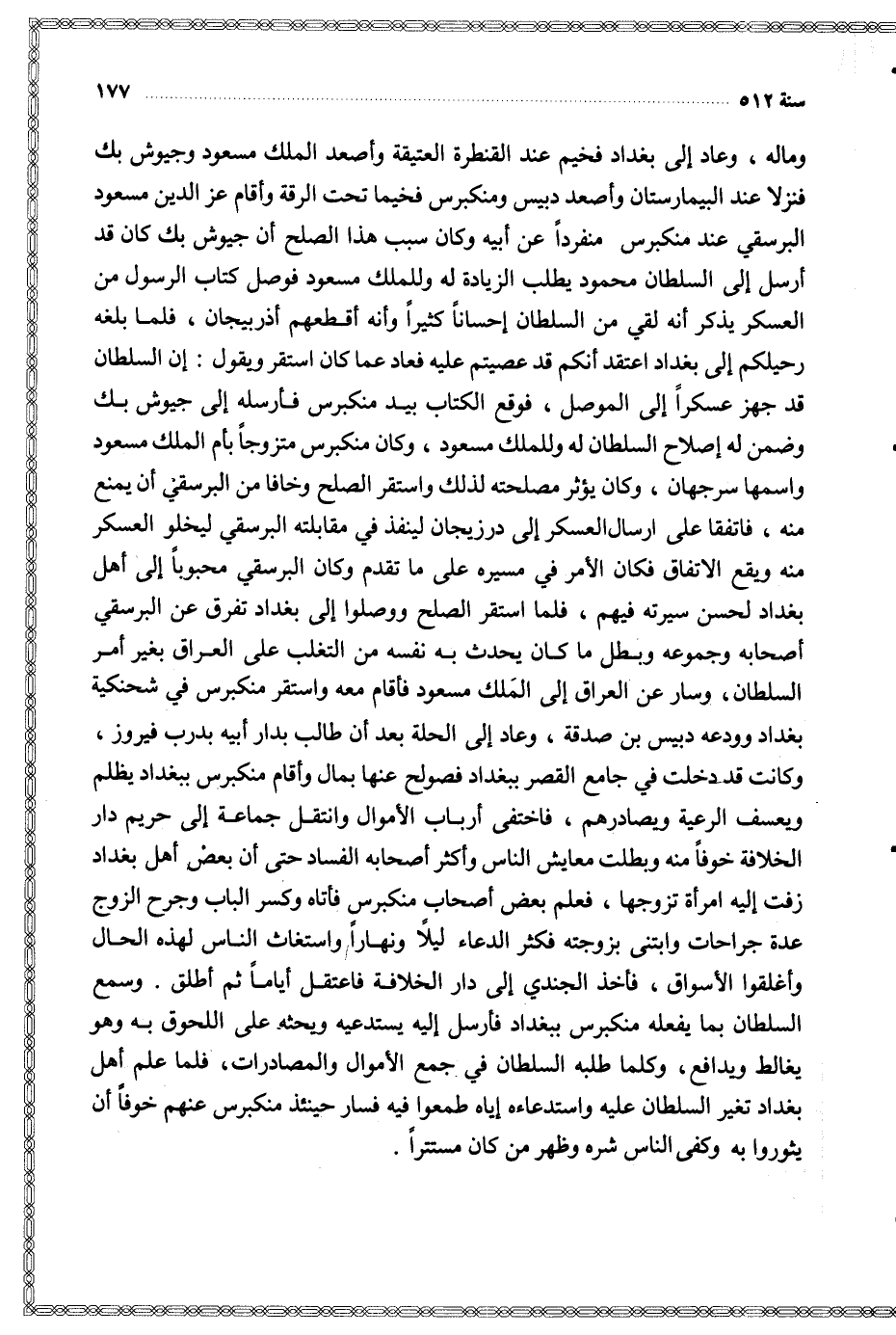 وماله وعاد إلى بغداد فخيم عند القنطرة العتيقة وأصعد الملك مسعود وجيوش بك فنزلا عند البيمارستان وأصعد دبيس ومنكبرس فخيما تحت الرقة وأقام عز الدين مسعود البرسقي عند منكبرس منفردا عن أبيه وكان سبب هذا الصلح أن جيوش بك كان قد أرسل إلى السلطان محمود يطلب الزيادة له وللملك مسعود فوصل كتاب الرسول من العسكر يذكر أنه لقي من السلطان إحسانا كثيرا وأنه أقطعهم أذربيجان فلما بلغه رحيلكم إلى بغداد اعتقد أنكم قد عصيتم عليه فعاد عما كان استقر ويقول إن السلطان قد جهز عسكرا إلى الموصل فوقع الكتاب بيد منكبرس فأرسله إلى جيوش بك وضمن له إصلاح السلطان له وللملك مسعود وكان منكبرس متزوجا بأم الملك مسعود واسمها سرجهان وكان يؤثر مصلحته لذلك واستقر الصلح وخافا من البرسقي أن يمنع منه فاتفقا على إرسال العساكر إلى درزيجان لينفذ في مقابلته البرسقي ليخلو العسكر منه ويقع الاتفاق فكان الأمر في مسيره على ما تقدم وكان البرسقي محبوبا إلى أهل بغداد لحسن سيرته فيهم فلما استقر الصلح ووصلوا إلى بغداد تفرق عن البرسقي أصحابه وجموعه وبطل ما كان يحدث به نفسه من التغلب على العراق بغير أمر السلطان وسار عن العراق إلى الملك مسعود فأقام معه واستقر منكبرس في شحنكية بغداد وودعه دبيس بن صدقة وعاد إلى الحلة بعد أن طالب بدار أبيه بدرب فيروز وكانت قد دخلت في جامع القصر ببغداد فصولح عنها بمال وأقام منكبرس ببغداد يظلم ويعسف الرعية ويصادرهم فاختفى أرباب الأموال وانتقل جماعة إلى حريم دار الخلافة خوفا منه وبطلت معايش الناس وأكثر أصحابه الفساد حتى أن بعض أهل بغداد زفت إليه امرأة تزوجها فعلم بعض أصحاب منكبرس فأتاه وكسر الباب وجرح الزوج عدة جراحات وابتنى بزوجته فكثر الدعاء ليلا ونهارا واستغاث الناس لهذه الحال وأغلقوا الأسواق فأخذ الجندي إلى دار الخلافة فاعتقل أياما ثم أطلق