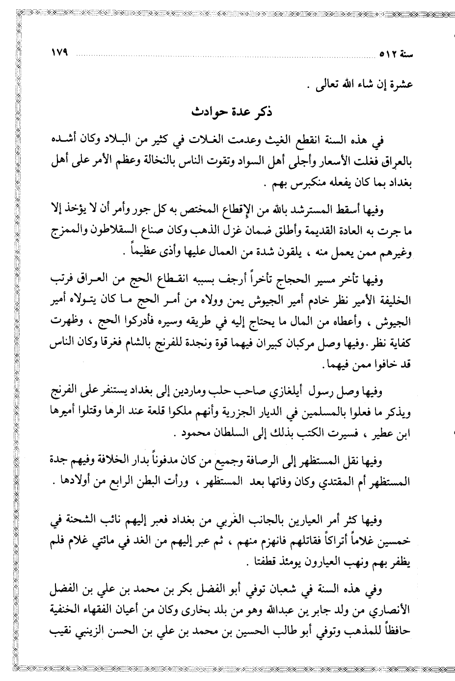 وفيها أسقط المسترشد بالله من الإقطاع المختص به كل جور وأمر أن لا يؤخذ إلا ما جرت به العادة القديمة أطلق ضمان غزل الذهب وكان صناع السقلاطون والممزج وغيرهم ممن يعمل منه يلقون شدة من العمال عليها وأذى عظيما
