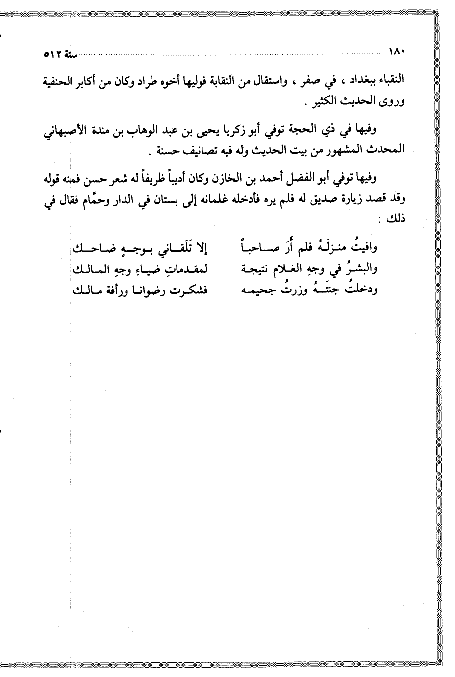 وفيها توفي أبو الفضل أحمد بن الخازن وكان أديبا ظريفا له شعر حسن فمنه قوله وقد قصد زيارة صديق له فلم يره فأدخله غلمانه إلى بستان في الدار وحمام فقال في ذلك