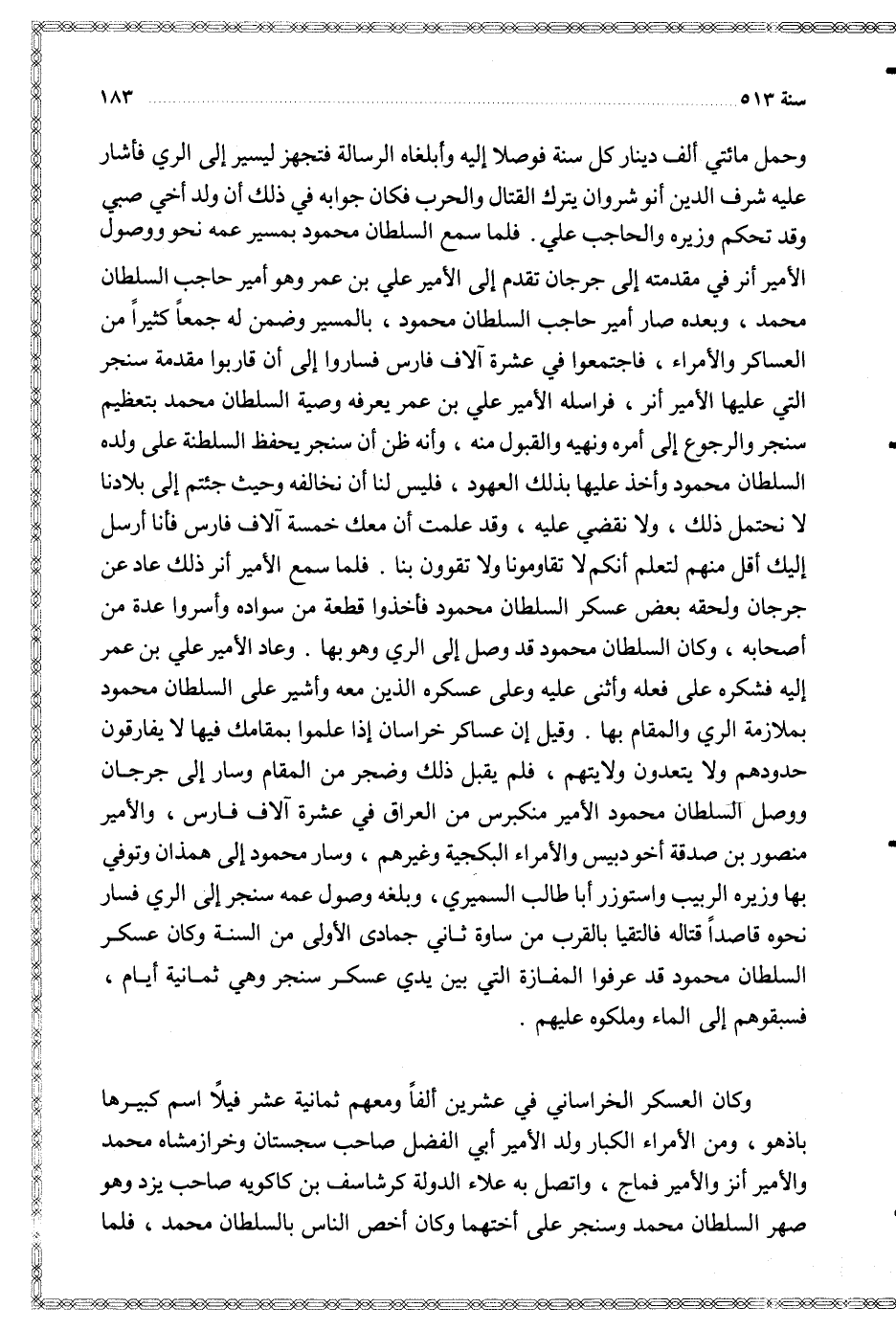 وكان العسكر الخارساني في عشرين ألفا ومعهم ثمانية عشر فيلا اسم كبيرها باذهو ومن الأمراء الكبار ولد الأمير أ [ ي الفضل صاحب سجستان وخرازمشاه محمد والأمير أنز والأمير فماج واتصل به علاء الدولة كرشاسف بن كاكويه صاحب يزد وهو صهر السلطان محمد وسنجر على أختهما وكان أخص الناس بالسلطان محمد فلما