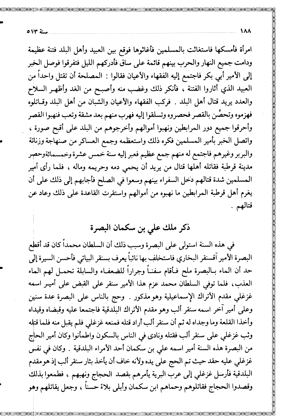 امرأة فأمسكها فاستغاثت بالمسلمين فأغاثوها فوقع بين العبيد وأهل البلد فتنة عظيمة ودامت جميع النهار والحرب بينهم قائمة على ساق فأدركهم الليل فتفرقوا فوصل الخبر إلى الأمير أبي بكر فاجتمع إليه الفقهاء والأعيان فقالوا المصلحة أن تقتل واحدا من العبيد الذين أثاروا الفتنة فأنكر ذلك وغضب منه وأصبح من الغد وأظهر السلاح والعدد يريد قتال أهل البلد
