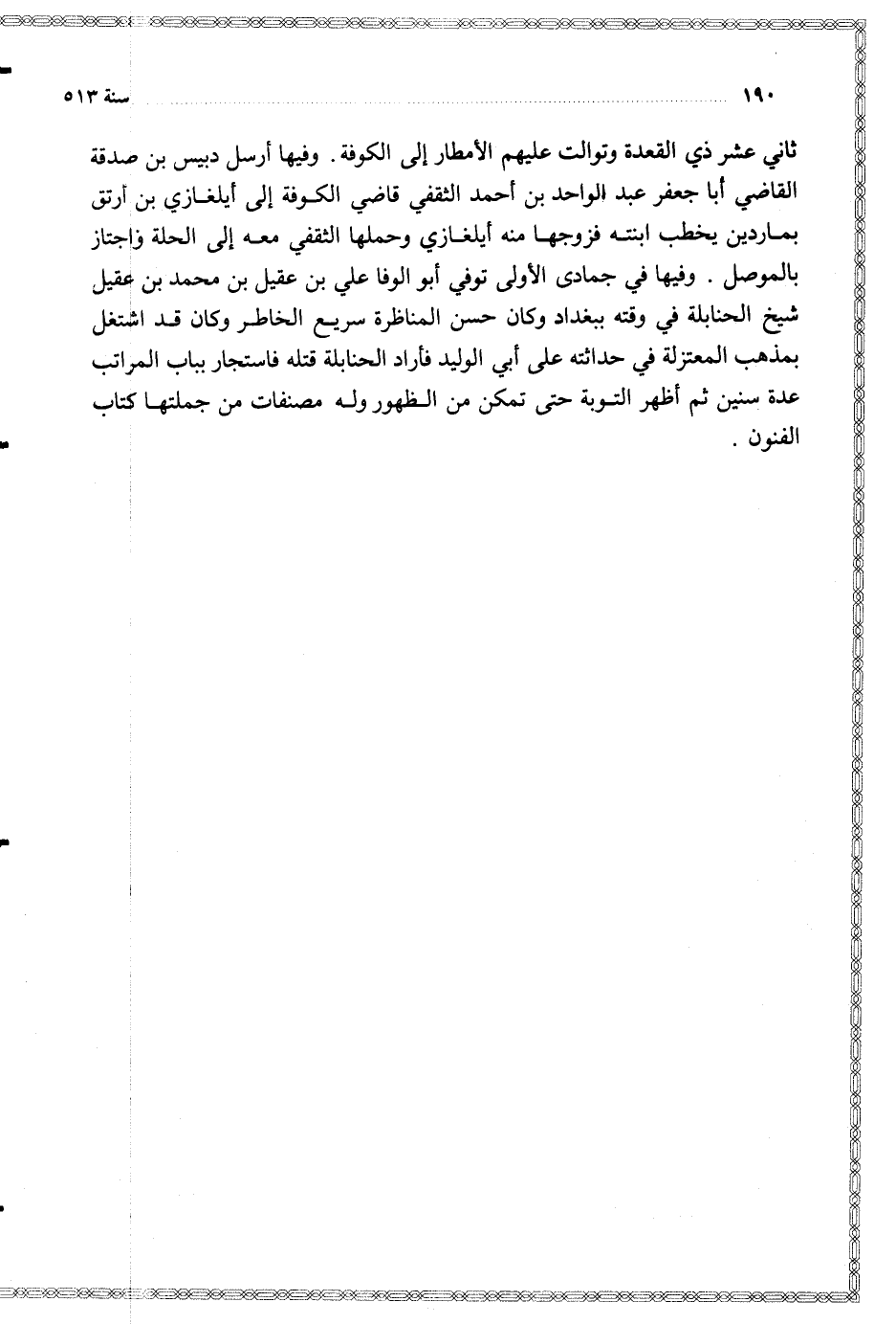 وفيها في جمادى الأولى توفي أبو الوفا علي بن عقيل بن محمد بن عقيل شيخ الحنابلة في وقته ببغداد وكان حسن المناظرة سريع الخاطر وكان قد اشتغل بمذهب المعتزلة في حداثته على أبي الوليد فأراد الحنابلة قتله فاستجار بباب المراتب عدة سنين ثم أظهر التوبة حتى تمكن من الظهور وله مصنفات من جملتها كتاب الفنون