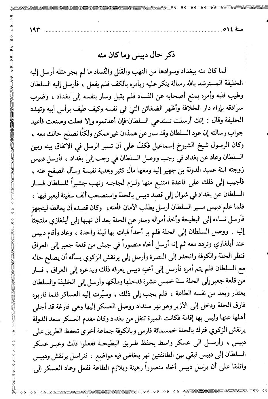 لما كان منه ببغداد وسوادها من النهب والقتل والفساد ما لم يجر مثله أرسل إليه الخليفة المسترشد بالله رسالة ينكر عليه ويأمره بالكف فلم يفعل فأرسل إليه السلطان وطيب قلبه وأمره بمنع أصحابه عن الفساد فلم يقبل وسار بنفسه إلى بغداد وضرب سرادقه بإزاء دار الخلافة وأظهر الضغائن التي في نفسه وكيف طيف برأس أبيه وتهدد الخليفة وقال إنك أرسلت تستدعي السلطان فغن أعدتموه وإلا فعلت وصنعت فأعيد جواب رسالته إن عود السلطان وقد سار عن همذان غير ممكن ولكنا نصلح حالك معه وكان الرسول شيخ الشيوخ إسماعيل فكف على أن تسير الرسل في الاتفاق بينه وبين السلطان وعاد عن بغداد في رجب ووصل السلطان في رجب إلى بغداد فأرسل دبيس زوجته ابنة عميد الدولة بن جهير إليه ومعها مال كثير وهدية نفيسة وسأل الصفح عنه فأجيب إلى ذلك على قاعدة امتنع منها ولزم لجاجه ونهب جشيرا للسلطان فسار السلطان عن بغداد في شوال إلى قصد دبيس بالحلة واستصحب ألف سفينة ليعبر فيها فلما علم دبيس مسير السلطان أرسل يطلب الأمان فأمنه وكان قصده أن يغالطه ليتجهز فأرسل نساءه إلى البطيحة وأخذ أمواله وسار عن الحلة بعد أن نهبها إلى أيلغازي ملتجئا إليه