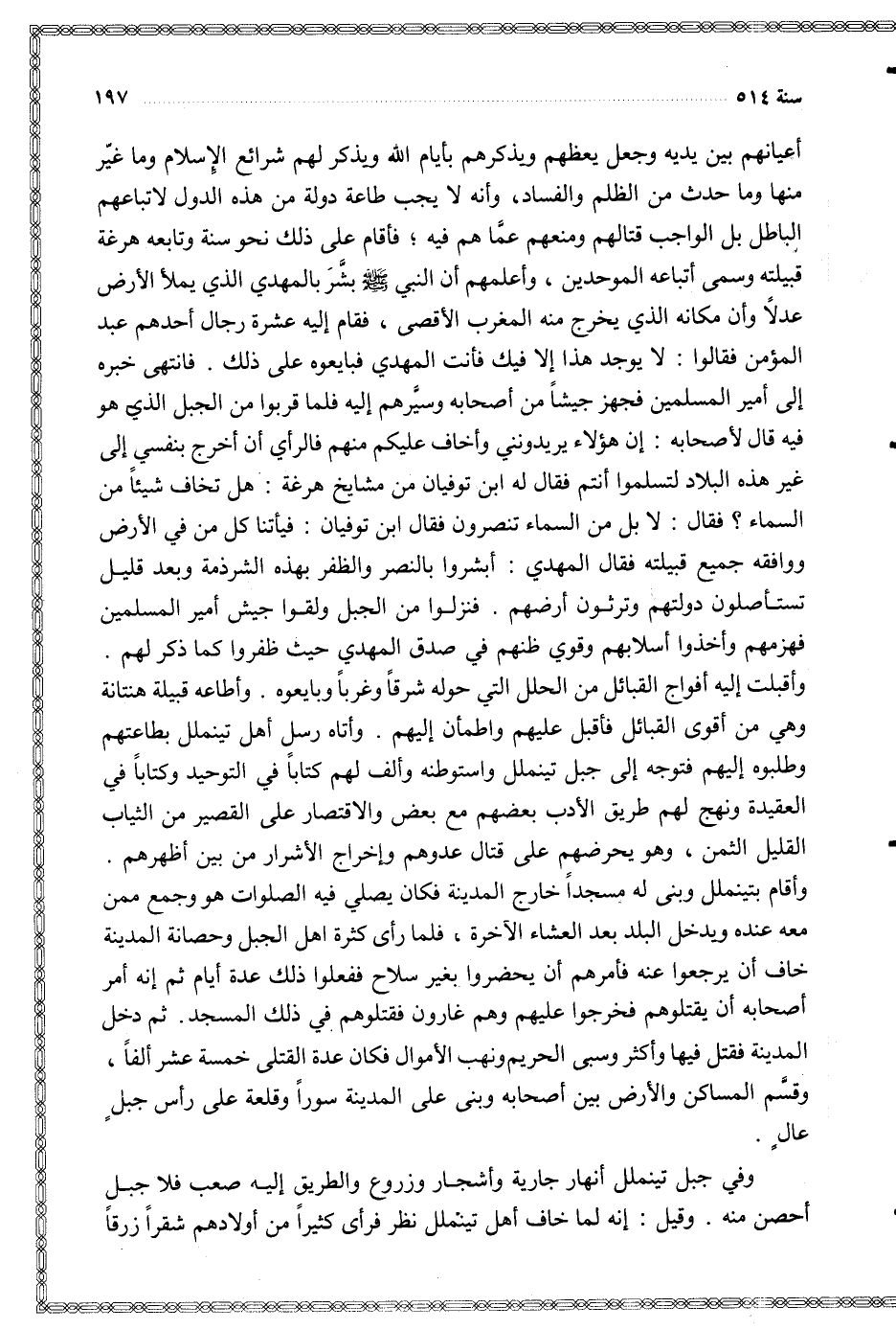 أعيانهم بين يديه وجعل يعظهم ويذكرهم بأيام الله ويذكر لهم شرائع الإسلام وما غير منها وما حدث من الظلم والفساد وأنه لا يجب طاعة دولة من هذه الدول لاتباعهم الباطل بل الواجب قتالهم ومنعهم عما هم فيه فأقام على ذلك نحو سنة وتابعه هرغة قبيلته وسمى أتباعه الموحدين وأعلمهم أن النبي بشر بالمهدي الذي يملأ الأرض عدلا وأن مكانه الذي يخرج منه المغرب الأقصى فقام إليه عشرة رجال أحدهم عبد المؤمن فقالوا لا يوجد هذا إلا فيك فأنت المهدي فبايعوه على ذلك