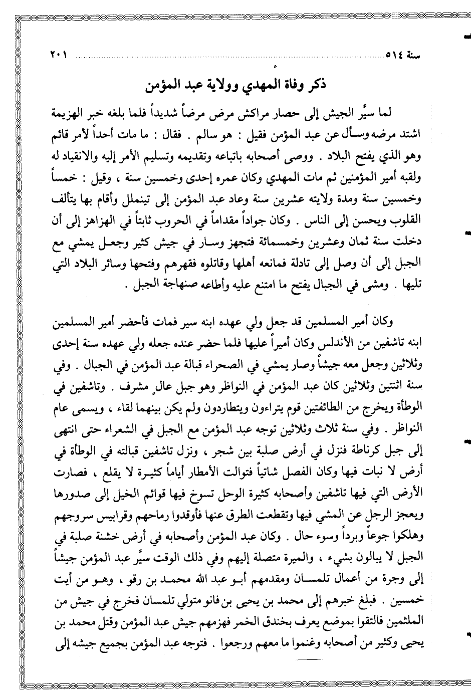 ووصى أصحابه باتباعه وتقديمه وتسليم الأمر إليه والانقياد له ولقبه أمير المؤمنين ثم مات المهدي وكان عمره إحدى وخمسين سنة وقيل خمسا وخمسين سنة ومدة ولايته عشرين سنة وعاد عبد المؤمن إلى تينملل وأقام بها يتألف القلوب ويحسن إلى الناس
