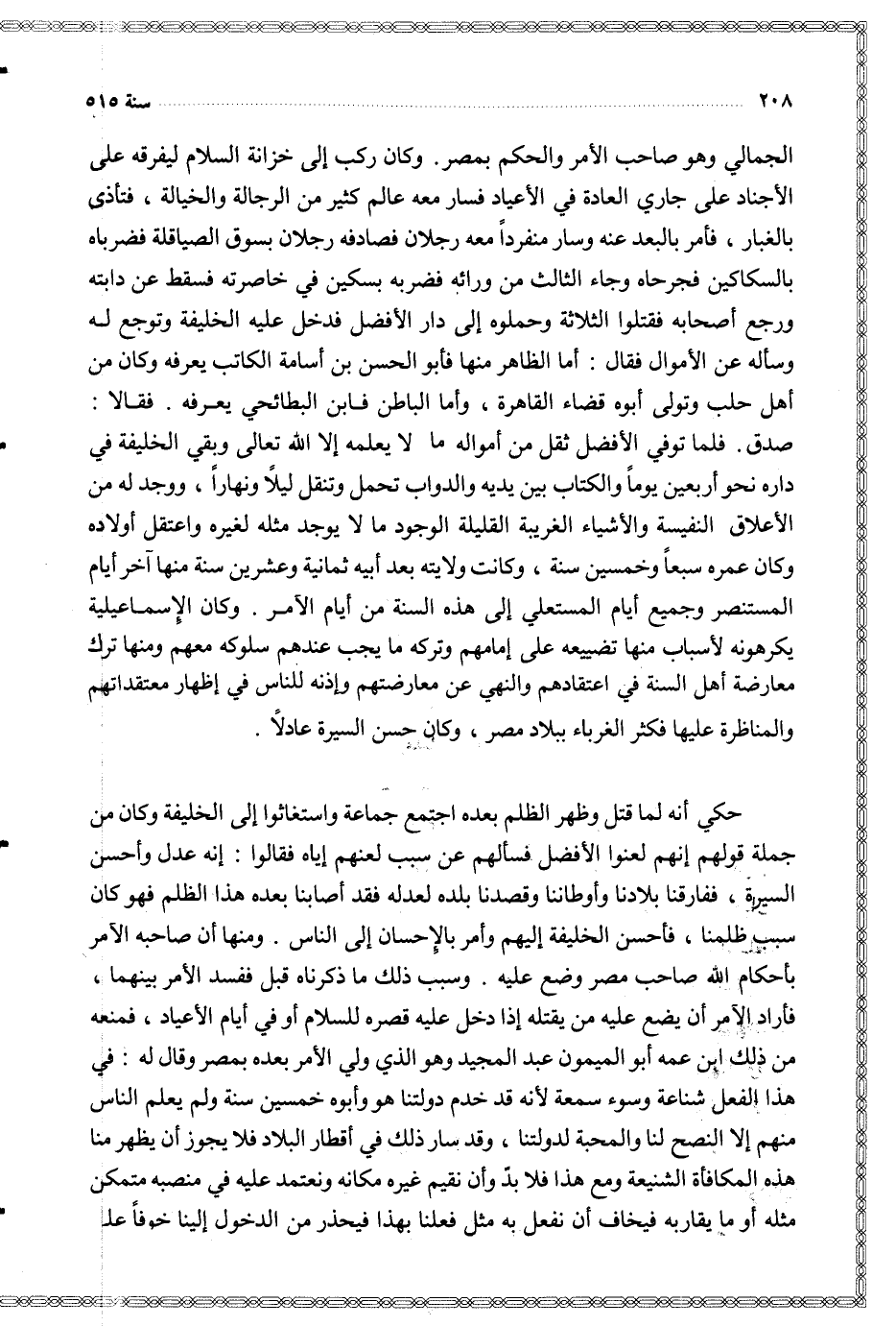 فلما توفي الأفضل ثقل من أمواله ما لا يعلمه إلا الله تعالى وبقي الخليفة داره نحو أربعين يوما والكتاب بين يديه والدواب تحمل وتنقل ليلا ونهارا ووجد له من الأعلاق النفيسة والأشياء الغريبة القليلة الوجود ما لا يوجد مثله لغيره واعتقل أولاده وكان عمره سبعا وخمسين سنة وكانت ولايته بعد أبيه ثمانية وعشرين سنة منها آخر أيام المستنصر وجميع أيام المستعلي إلى هذه السنة من أيام الآمر