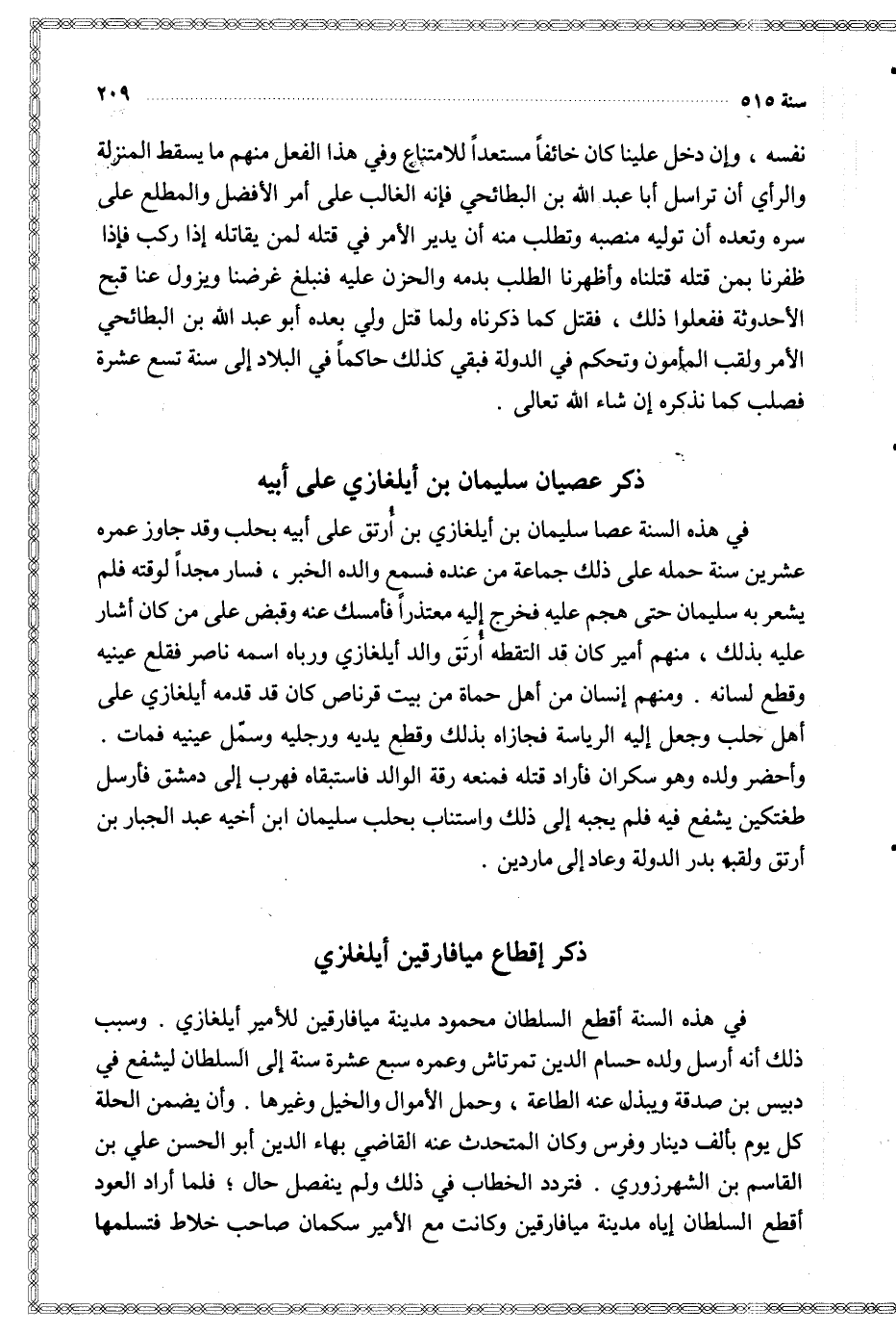 وأحضر ولده وهو سكران فأراد قتله فمنعه رقة الوالد فاستبقاه فهرب إلى دمشق فأرسل طغتكين يشفع فيه فلم يجبه إلى ذلك واستناب بحلب سليمان ابن أخيه عبد الجبار بن أرتق ولقبه بدر الدولة وعاد إلى ماردين