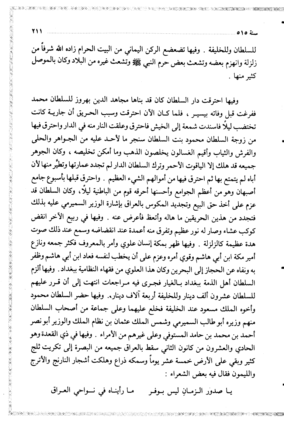 ( يا صدور الزمان ليس بوفر ... ما رأيناه في نواحي العراق )