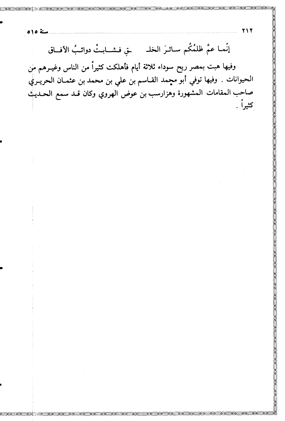 وفيها توفي أبو محمد القاسم بن علي بن محمد بن عثمان الحريري صاحب المقامات المشهورة وهزارسب بن عوض الهروي وكان قد سمع الحديث كثيرا