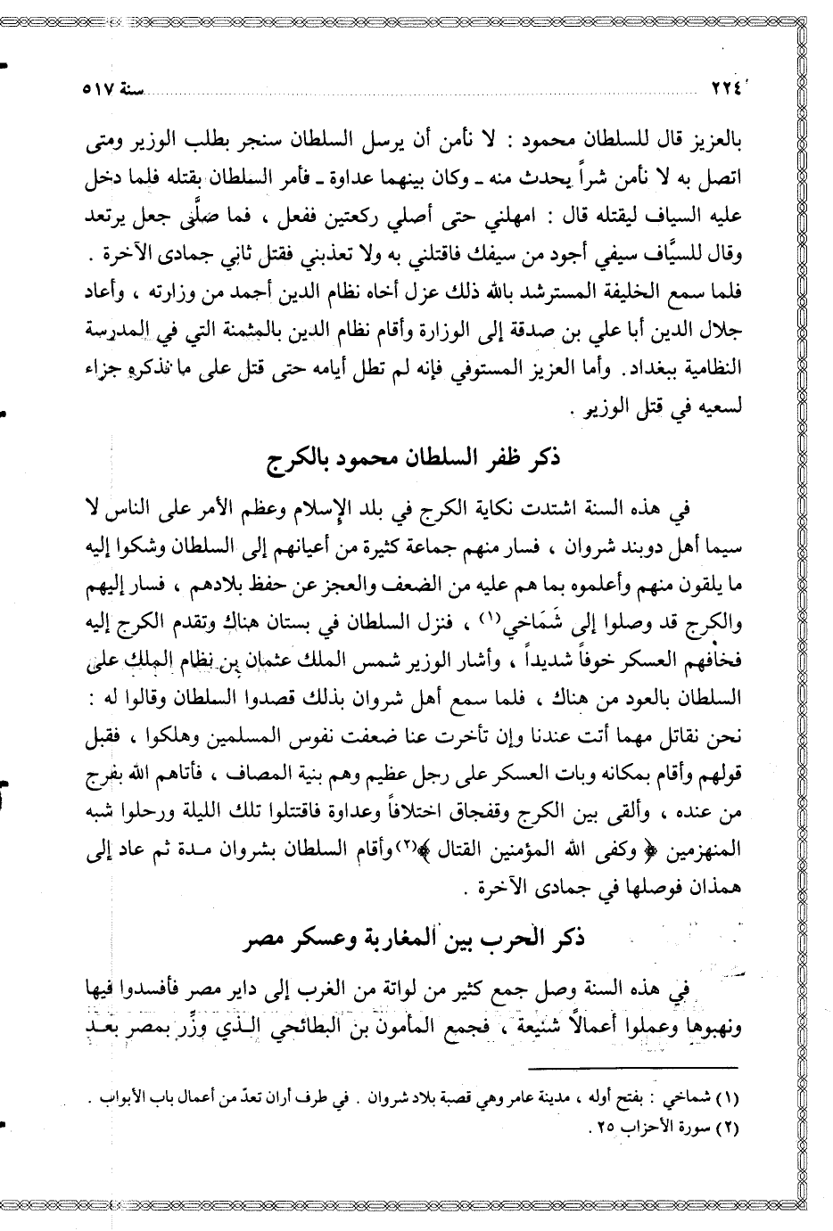في هذه السنة اشتدت نكاية الكرج في بلد الإسلام وعظم المر على الناس لا سيما أهل دوبند شروان فسار منهم جماعة كثيرة من أعيانهم إلى السلطان وشكوا إليه ما يلقون منهم وأعلموه بما هم عليه من الضعف والعجز عن حفظ بلادهم فسار إليهم والكرج قد وصلوا إلى شماخي فنزل السلطان في بستان هناك وتقدم الكرج إليه فخافهم العسكر خوفا شديدا وأشار الوزير شمس الملك عثمان بن نظام الملك على السلطان بالعود من هناك فلما سمع أهل شروان بذلك قصدوا السلطان وقالوا له نحن نقاتل مهما أتت عندنا وإن تأخرت عنا ضعفت نفوس المسلمين وهلكوا فقبل وقولهم وأقام بمكانه وبات العسكر على رجل عظيم وهم بينة المصاف فأتاهم الله بفرج من عنده وألقى بين الكرج وقفجاق اختلافا وعداوة فاقتتلوا تلك الليلة ورحلوا شبه المنهزمين { وكفى الله المؤمنين القتال } وأقام السلطان بشروان مدة ثم عاد إلى همذان فوصلها في جمادى الآخرة