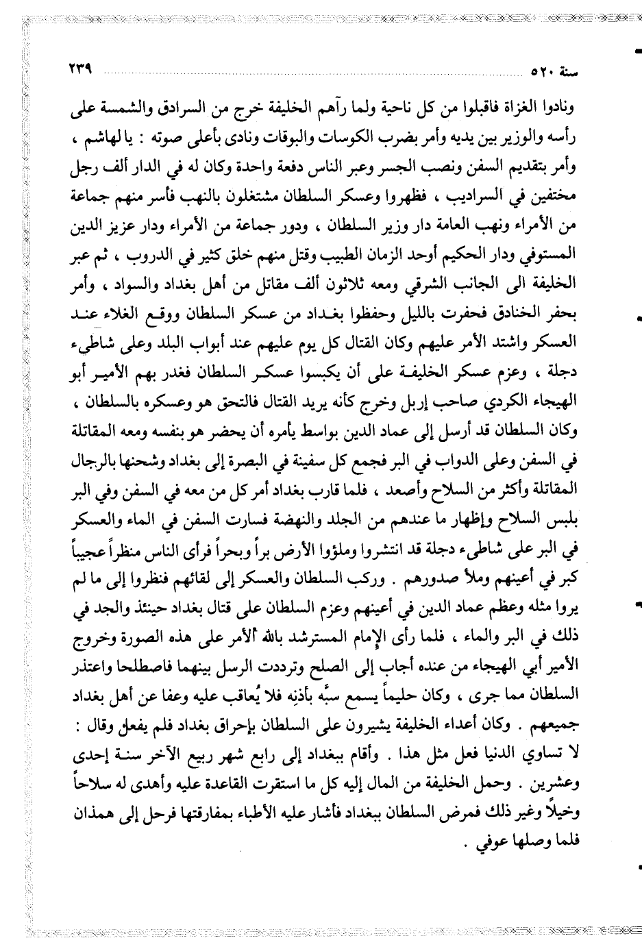 ونادوا الغزاة فأقبلوا من كل ناحية ولما رآهم الخليفة خرج من السرداق والشمسة على رأسه والوزير بين يديه وأمر بضرب الكوسات والبوقات ونادى بأعلى صوته يا لهاشم وأمر بتقديم السفن ونصب الجسر وعبر الناس دفعة واحدة وكان له في الدار ألف رجل مختفين في السراديب فظهروا وعسكر السلطان مشتغلون بالنهب فأسر منهم جماعة من الأمراء ونهب العامة دار وزير السلطان ودور جماعة من الأمراء ودار عزيز الدين المستوفي ودار الحكيم أوحد الزمان الطبيب وقتل منهم خلق كثير في الدروب ثم عبر الخليفة إلى الجانب الشرقي ومعه ثلاثون ألف مقاتل من أهل بغداد والسواد وأمر بحفر الخنادق فحفرت بالليل وحفظوا بغداد من عسكر السلطان ووقع الغلاء عند العسكر واشتد الأمر عليهم أبواب البلد وعلى شاطئ دجلة وعزم عسكر الخليفة على أن يكسبوا عسكر السلطان فغدر بهم الأمير أبو الهيجاء الكردي صاحب إربل وخرج كأنه يريد القتال فالتحق هو وعسكره بالسلطان وكان السلطان قد أرسل إلى عماد الدين بواسط يأمره أن يحضر هو بنفسه ومعه المقاتلة في السفن وعلى الدواب في البر فجمع كل سفينة في البصرة وإلى بغداد وشحنها بالرجال المقاتلة وأكثر من السلاح وأصعد فلما قارب بغداد أمر كل من معه في السفن وفي البر بلبس السلاح وإظهار ما عندهم من الجلد والنهضة فسارت السفن في الماء والعسكر في البر على شاطئ دجلة قد انتشروا وملؤوا الأرض برا وبحرا فرأى الناس منظرا عجيبا كبر في أعينهم وملأ صدورهم