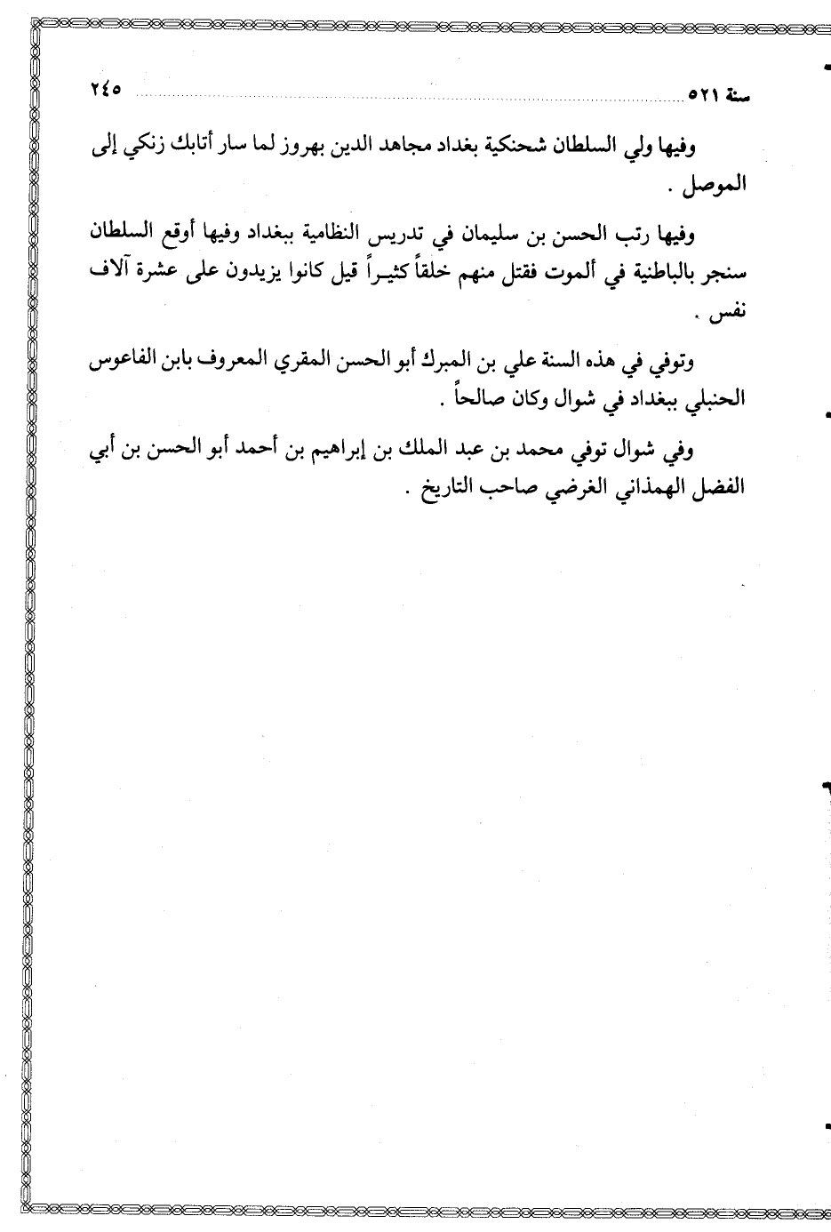 وفي شوال توفي محمد بن عبد الملك بن إبراهيم بن أحمد أبو الحسن بن أبي الفضل الهمذاني الغرضي صاحب التاريخ