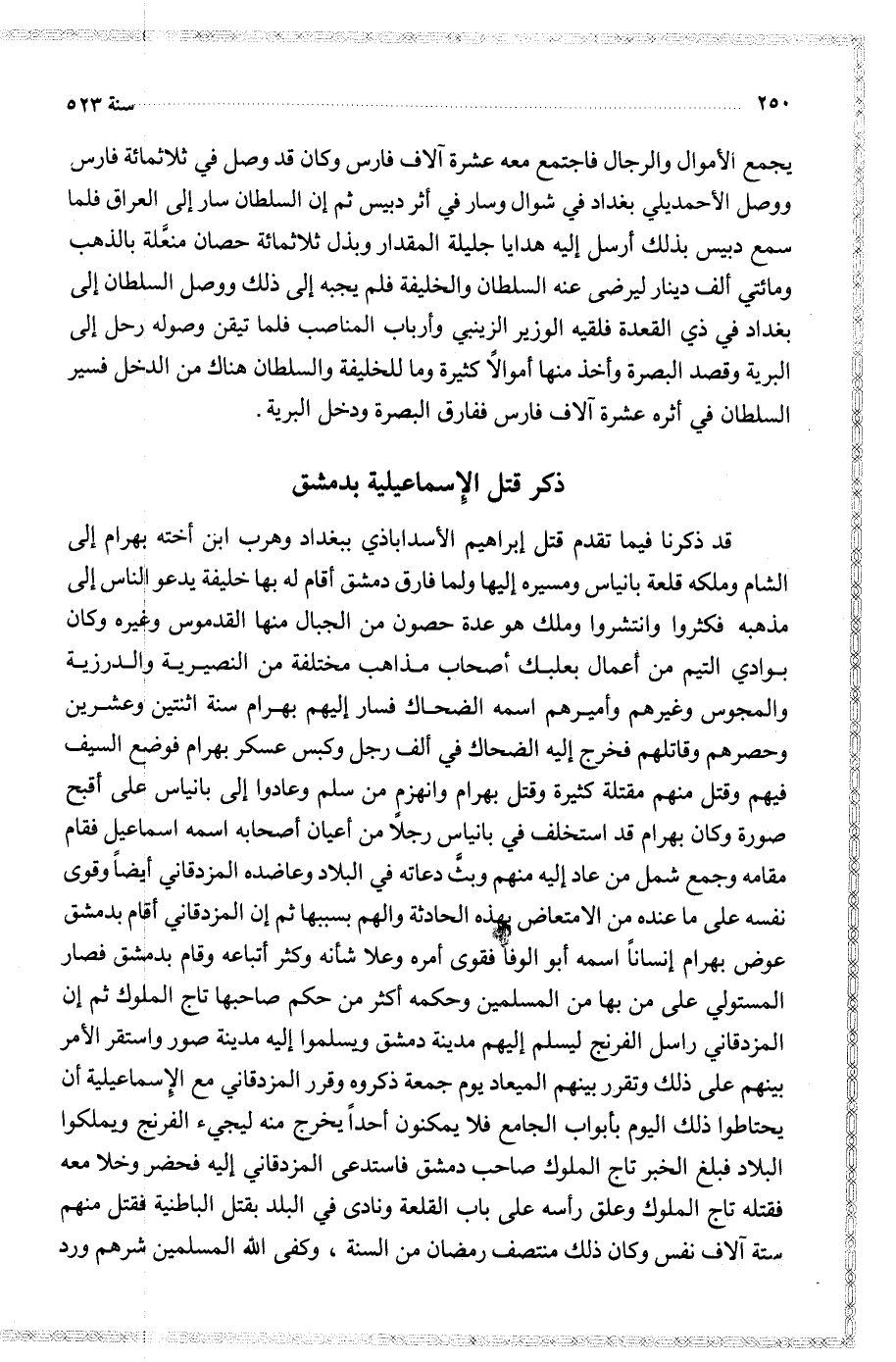 قد ذكرنا فيما تقدم قتل إبراهيم الأسداباذي ببغداد وهرب ابن أخته بهرام إلى الشام وملكه قلعة بانياس ومسيره إليها ولما فارق دمشق أقام بها خليفة يدعو الناس إلى مذهبه فكثروا وانتشروا وملك هو عدة حصون من الجبال منها القدموس وغيره وكان بوادي التيم من أعمال بعلبك أصحاب مذاهب مختلفة من النصيرية والدرزية والمجوس وغيرهم وأميرهم اسمه الضحاك فسار إليهم بهرام سنة اثنتين وعشرين وجحصرهم وقاتلهم فخرج إليه الضحاك في ألف رجل وكبس عسكر بهرام فوضع السيف فيهم وقتل منهم مقتلة كثيرة وقتل بهرام وانهزم من سلم وعادوا إلى بانياس على أقبح صورة وكان بهرام قد استخلف في بانياس رجلا من أعيان أصحابه اسمه أصحابه اسمه إسماعيل فقام مقامه وجمع شمل من عاد إليهم منهم وبث دعاته في البلاد وعاضده المزدقاني أيضا وقوى نفسه على ما عنده من الامتعاض بهذه الحادثة والهم بسببها ثم إن المزدقاني أقام بدمشق عوض بهرام إنسانا اسمه أبو الوفا فقوى أمره وعلا شأنه وكثر أتباعه وقام بدمشق فصار المستولي على من بها من المسلمين وحكمه أكثر من حكم صاحبها تاج الملوك ثم إن المزدقاني راسل الفرنج ليسلم إليهم مدينة دمشق ويسلموا إليه مدينة صور واستقر الأمر بينهم على ذلك وتقرر بينهم الميعاد يوم جمعة ذكروه وقرر المزدقاني مع الإسماعيلية أن يحتاطوا ذلك اليوم بأبواب الجامع فلا يمكنون أحدا يخرج منه ليجيء الفرنج ويملكوا البلاد فبلغ الخبر تاج الملوك صاحب دمشق فاستدعى المزدقاني إليه فحضر وخلا معه فقتله تاج الملوك وعلق رأسه على باب القلعة ونادى في البلد بقتل الباطنية فقتل منهم ستة آلاف نفس وكان ذلك منتصف رمضان من السنة وكفى الله المسلمين شرهم ورد
