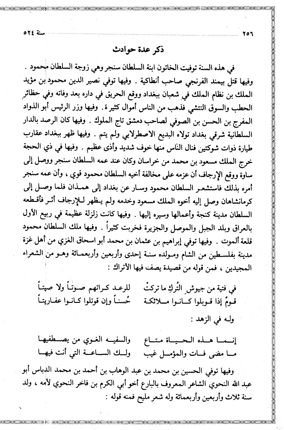 وفيها توفي الحسين بن محمد بن عبد الوهاب بن أحمد بن محمد الدباس أبو عبد الله النحوي الشاعر المعروف بالبارع أخو أبي الكرم بن فاخر النحوي لأمه ولد سنة ثلاث وأربعين وأربعمائة وله شعر مليح فمنه قوله