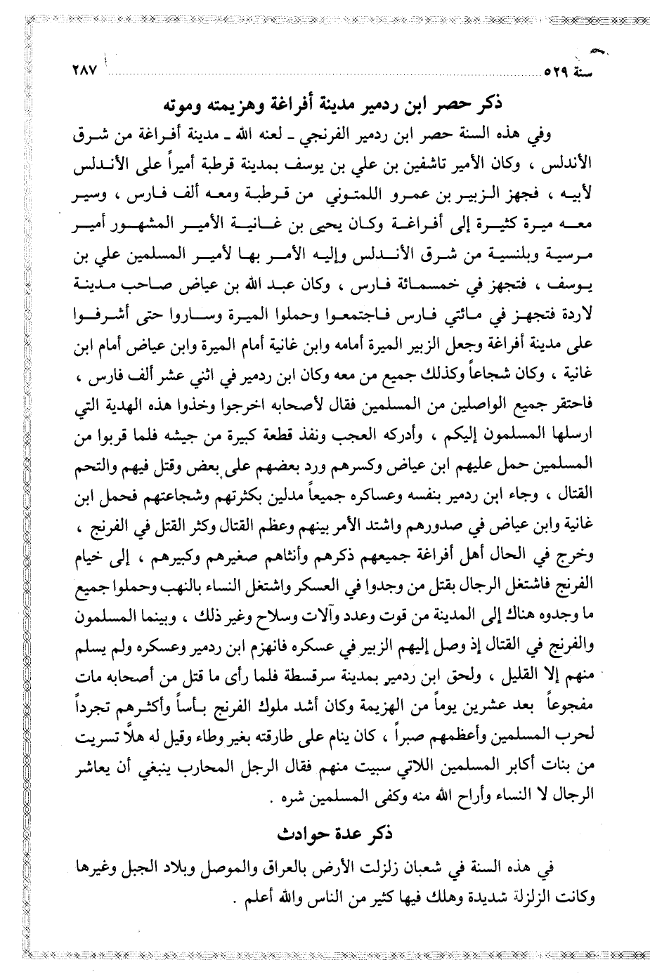 وفي هذه السنة حصر ابن ردمير الفرنجي لعنه الله مدينة أفراغة من شرق الأندلس وكان الأمير تاشفين بن علي بن يوسف بمدينة قرطبة أميرا على الأندلس لأبيه فجهز الزبير بن عمرو اللمتوني من قرطبة ومعه ألف فارس وسير معه ميرة كثيرة إلى أفراغة وكان يحيى بن غانية الأمير المشهور أمير مرسية وبلنسية من شرق الأندلس وإليه الأمر بها لأمير المسلمين علي بن يوسف فتجهز في خمسمائة فارس وكان عبد الله بن عياض صاحب مدينة لاردة فتجهز في مائتي فارس فاجتمعوا وحملوا الميرة وساروا حتى أشرفوا على مدينة أفراغة وجعل الزبير الميرة أمامه وابن غانية أمام الميرة وابن عياض أمام ابن غانية وكان شجاعا وكذلك جميع من معه وكان ابن ردمير في اثني عشر ألف فارس فاحتقر جميع الواصلين من المسلمين فقال لأصحابه اخرجوا وخذوا هذه الهدية التي ارسلها المسلمون إليكم وأدركه العجب ونفذ قطعة كبيرة من جيشه فلما قربوا من المسلمين حمل عليهم ابن عياض وكسرهم ورد بعضهم على بعض وقتل فيهم والتحم القتال وجاء ابن ردمير بنفسه وعساكره جميعا مدلين بكثرتهم وشجاعتهم فحمل ابن غانية وابن عياض في صدورهم واشتد الأمر بينهم وعظم القتال وكثر القتل في الفرنج وخرج في الحال أهل أفراغة جميعهم ذكرهم وأنثاهم صغيرهم وكبيرهم إلى خيام الفرنج فاشتعل الرجال بقتل من وجدوا في العسكر واشتغل النساء بالنهب وحملوا جميع ما وجدوه هناك إلى المدينة من قوت وعدد وآلات وسلاح وغير ذلك وبينما المسلمون والفرنج في القتال إذ وصل إليهم الزبير في عسكره فانهزم ابن ردمير وعسكره ولم يسلم منهم إلا القليل ولحق ابن ردمير بمدينة سرقسطة فلما رأى ما قتل من أصحابه مات مفجوعا بعد عشرين يوما من الهزيمة وكان أشد ملوك الفرنج بأسا وأكثرهم تجردا لحرب المسلمين وأعظمهم صبرا كان ينام على طارقته بغير وطاء وقيل له هلا تسريت من بنات أكابر المسلمين اللاتي سبيت منهم فقال الرجل المحارب ينبغي أن يعاشر الرجال لا النساء وأراح الله منه وكفى المسلمين شره