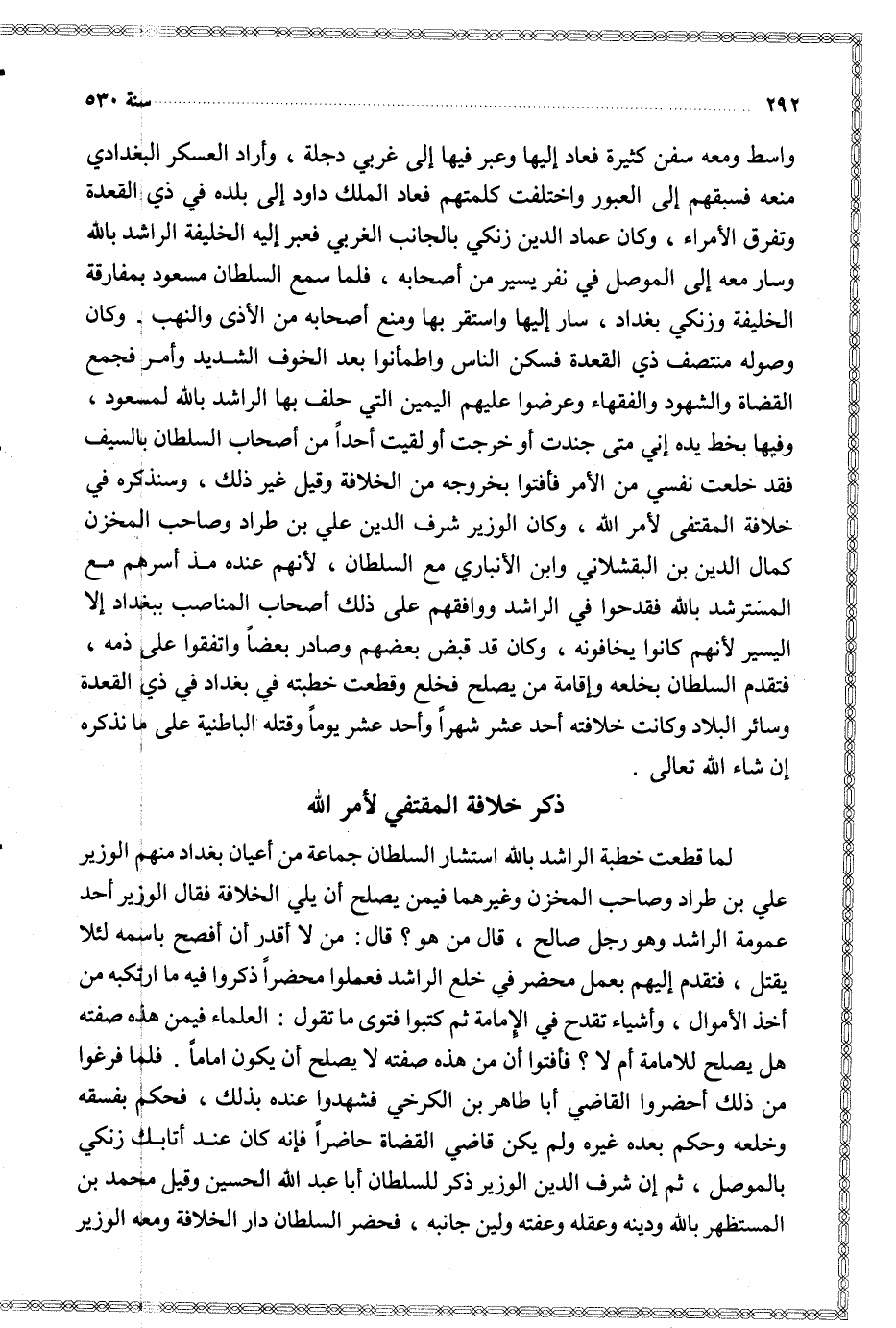 لما قطعت خطبة الراشد بالله استشار السلطان جماعة من أعيان بغداد منهم الوزير علي بن طراد وصاحب المخزن وغيرهما فيمن يصلح أن يلي الخلافة فقال الوزير أحد عمومة الراشد وهو رجل صالح قال من هو قال من لا أقدر أن أفصح باسمه لئلا يقتل فتقدم إليهم بعمل محضر في خلع الراشد فعملوا محضرا ذكروا فيه ما ارتكبه من أخذ الأموال وأشياء تقدح في الإمامة ثم كتبوا فتوى ما تقول العلماء فيمن هذه صفته هل يصلح للامامة أم لا فأفتوا أن من هذه صفته لا يصلح أن يكون اماما
