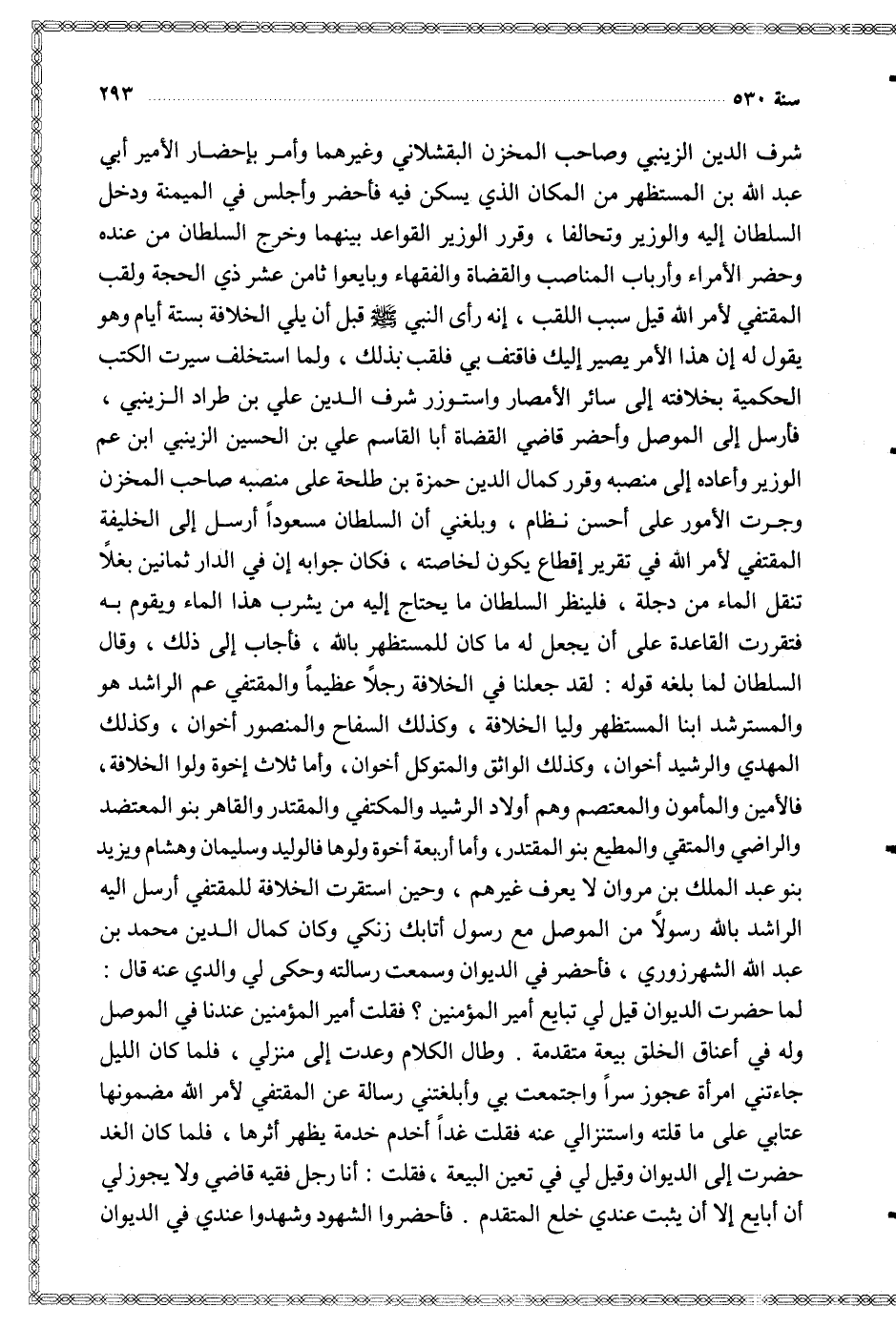 شرف الدين الزينبي وصاحب المخزن البقشلاني وغيرهما وأمر بإحضار الأمير أبي عبد الله المستظهر من المكان الذي يسكن فيه فأحضر وأجلس في الميمنة ودخل السلطان إليه والوزير وتحالفا وقرر الوزير القواعد بينهما وخرج السلطان من عنده وحضر الأمراء وأرباب المناصب والقضاة والفقهاء وبايعوا ثامن عشر ذي الحجة ولقب المقتفي لأمر الله قيل سبب اللقب إنه رأى النبي قبل أن يلي الخلافة بستة أيام وهو يقول له إن هذا الأمر يصير إليك فاقتف بي فلقب بذلك ولما استخلف سيرت الكتب الحكمية بخلافته إلى سائر الأمصار واستوزر شرف الدين علي بن طراد الزينبي فأرسل إلى الموصل وأحضر قاضي القضاة أبا القاسم علي بن الحسين الزينبي ابن عم الوزير وأعاده إلى منصبه وقرر كمال الدين حمزة بن طلحة على منصبه صاحب المخزن وجرت الأمور على أحسن نظام وبلغني أن السلطان مسعودا أرسل إلى الخليفة المقتفي لأمر الله في تقرير إقطاع يكون لخاصته فكان جوابه إن في الدار ثمانين بغلا تنقل الماء من دجلة فلينظر السلطان ما يحتاج إليه من يشرب هذا الماء ويقوم به فتقررت القاعدة على أن يجعل له ما كان للمستظهر بالله فأجاب إلى ذلك وقال السلطان لما بلغه قوله لقد جعلنا في الخلافة رجلا عظيما والمقتفي عم الراشد هو والمسترشد ابنا المستظهر وليا الخلافة وكذلك السفاح والمنصور أخوان وكذلك المهدي والرشيد أخوان وكذلك الواثق والمتوكل أخوان وأما ثلاث إخوة ولوا الخلافة فالأمين والمأمون والمعتصم وهم أولاد الرشيد والمكتفي والمقتدر والقاهر بنو المعتضد والراضي والمتقي والمطيع بنو المقتدر وأما أربعة أخوة ولوها فالوليد وسليمان وهشام ويزيد بنو عبد الملك بن مروان لا يعرف غيرهم وحين استقرت الخلافة للمقتفي أرسل إليه الراشد بالله رسولا من الموصل مع رسول أتابك زنكي وكان كمال الدين محمد بن عبد الله الشهرزوري فأحضر في الديوان وسمعت رسالته وحكى لي والدي عنه قال لم حضرت الديوان قيل لي تبايع أمير المؤمنين فقلت أمير المؤمنين عندنا في الموصل وله في أعناق الخلق بيعة متقدمة