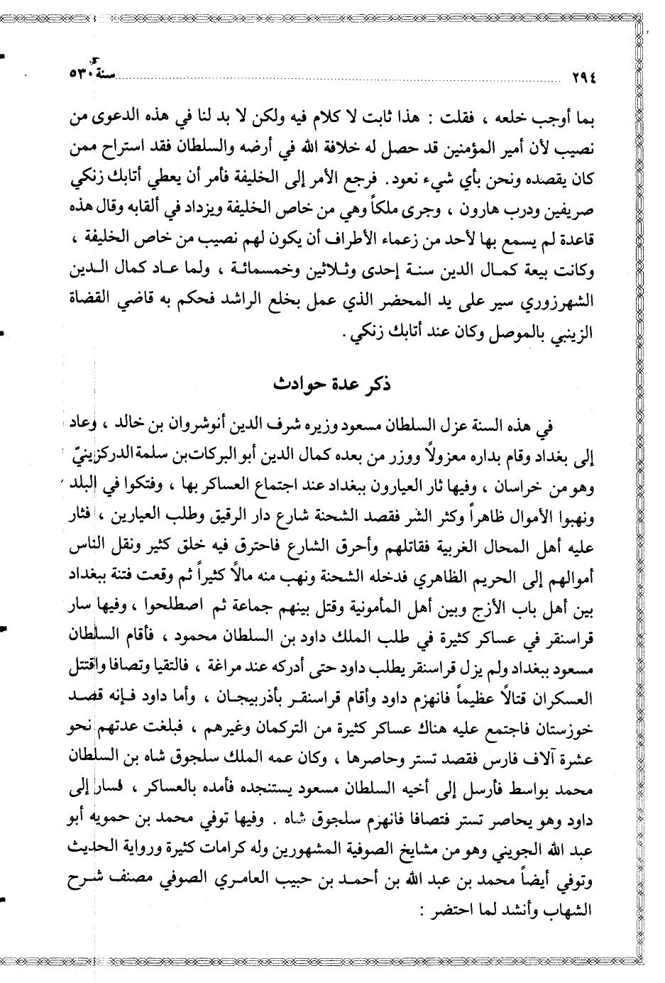 فرجع الأمر إلى الخليفة فأمر أن يعطي أتابك زنكي صريفين ودرب هارون وجرى ملكا وهي من خاص الخليفة ويزداد في ألقابه وقال هذه قاعدة لم يسمع بها لأحد من زعماء الأطراف أن يكون لهم نصيب من خاص الخليفة وكانت بيعة كمال الدين سنة إحدى وثلاثين وخمسمائة ولما عاد كمال الدين الشهرزوري سير على يد المحضر الذي عمل بخلع الراشد فحكم به قاضي القضاة الزينبي بالموصل وكان عند أتابك زنكي