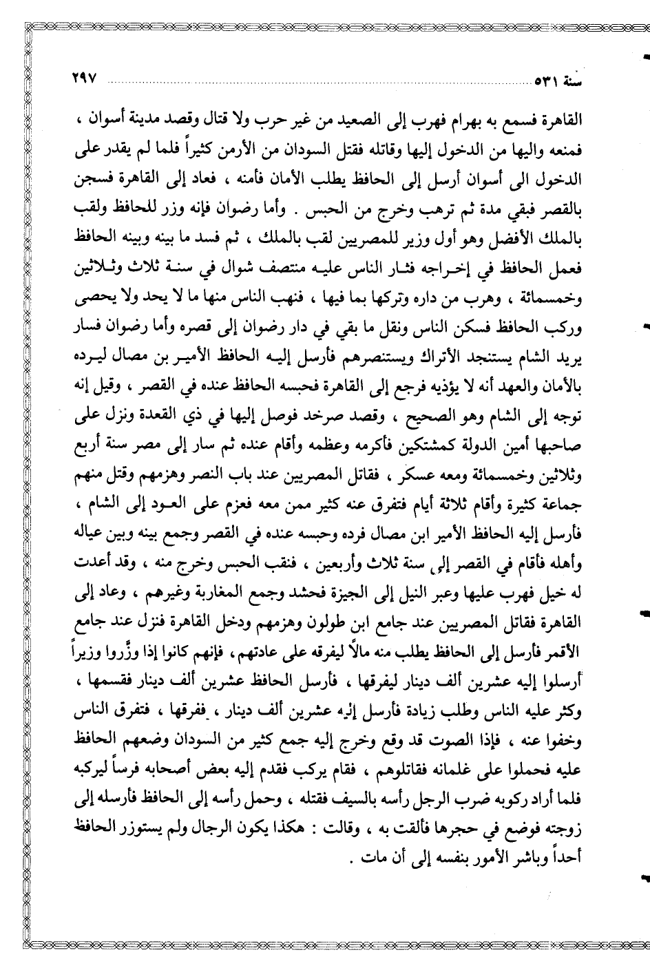 القاهرة فسمع به بهرام فهرب إلى الصعيد من غير حرب ولا قتال وقصد مدينة أسوان فمنعه واليها من الدخول إليها وقاتله فقتل السودان من الأرمن كثيرا فلما لم يقدر على الدخول إلى أسوان أرسل إلى الحافظ يطلب الأمان فأمنه فعاد إلى القاهرة فسجن بالقصر فبقي مدة ثم ترهب وخرج من الحبس