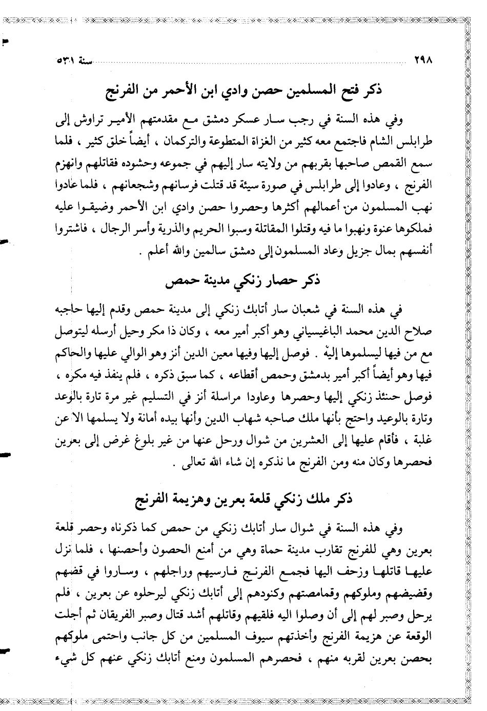 وفي هذه السنة في شوال سار أتابك زنكي من حمص كما ذكرناه وحصر قلعة بعرين وهي للفرنج تقارب مدينة حماة وهي من أمنع الحصون وأحصنها فلما نزل عليها قاتلها وزحف إليها فجمع الفرنج فارسيهم وراجلهم وساروا في قضهم وقضيضهم وملوكهم وقمامصتهم وكنودهم إلى أتابك زنكي ليرحلوه عن بعرين فلم يرحل وصبر لهم إلى أن وصلوا إليه فلقيهم وقاتلهم أشد قتال وصبر الفريقان ثم أجلت الوقعة عن هزيمة الفرنج وأخذتهم سيوف المسلمين من كل جانب واحتمى ملوكهم بحصن بعرين لقربه منهم فحصرهم المسلمون ومنع أتابك زنكي عنهم كل شيء