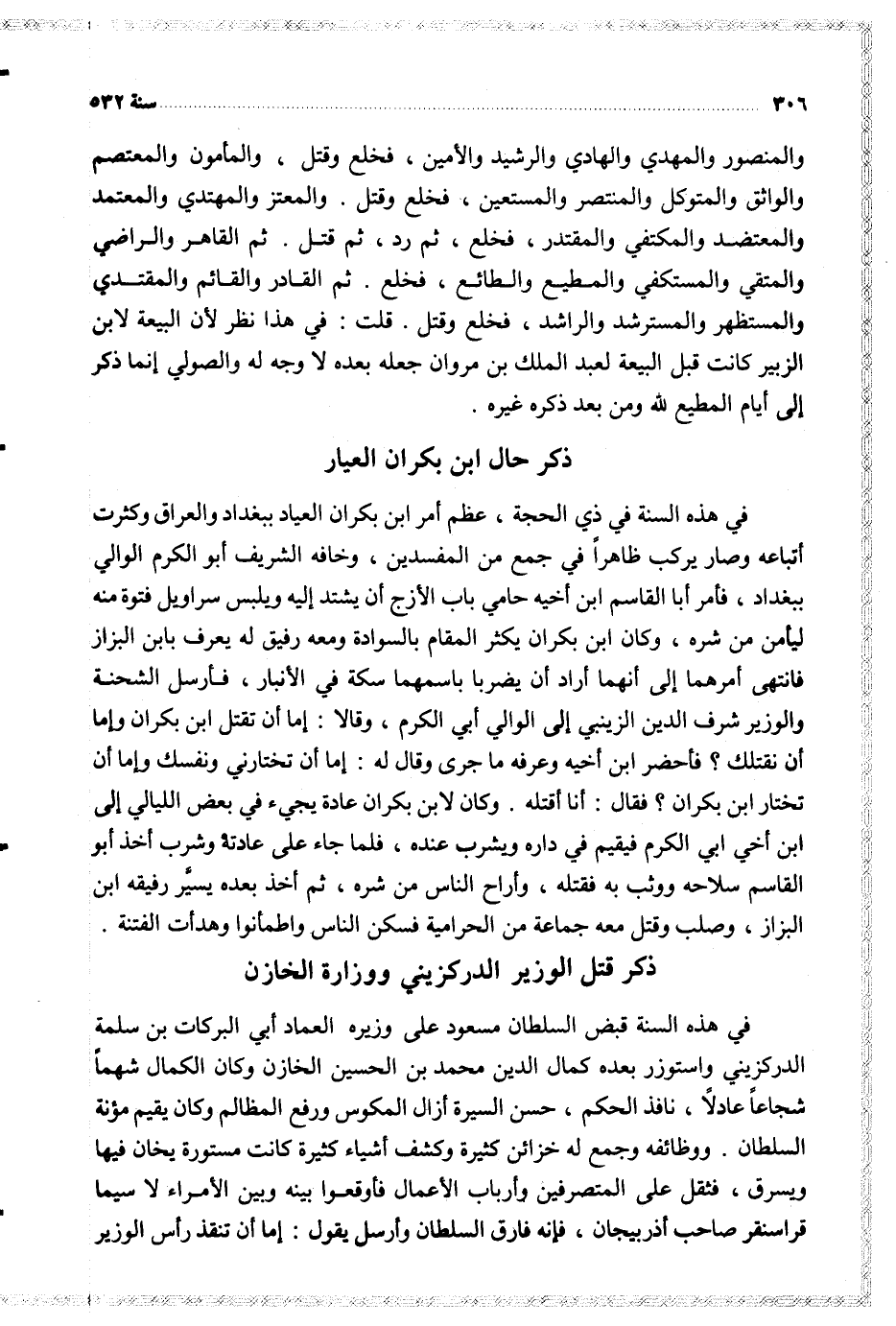 وكان لابن بكران عادة يجيء في بعض الليالي إلى ابن أخي أبي الكرم فيقيم في داره ويشرب عنده فلما جاء على عادته وشرب أخذ أبو القاسم سلاحه ووثب به فقتله وأراح الناس من شره ثم أخذ بعده يسير رفيقه ابن البزاز وصلب وقتل معه جماعة من الحرامية فسكن الناس واطمأنوا وهدأت الفتنة
