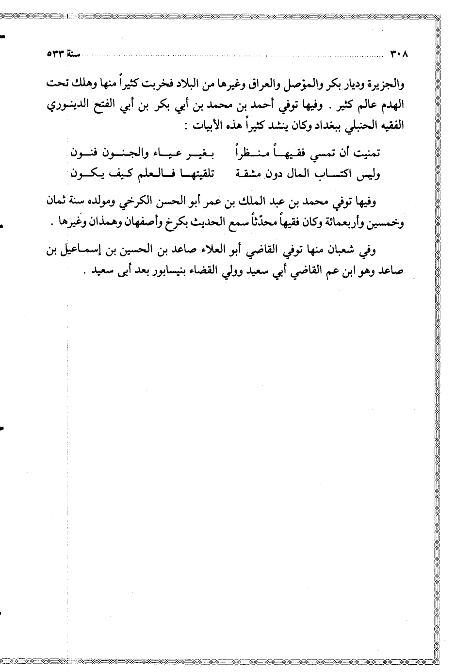 وفيها توفي محمد بن عبد الملك بن عمر أبو الحسن الكرخي ومولده سنة ثمان وخمسين وأربعمائة وكان فقيها محدثا سمع الحديث بكرخ وأصفهان وهمذان وغيرهما