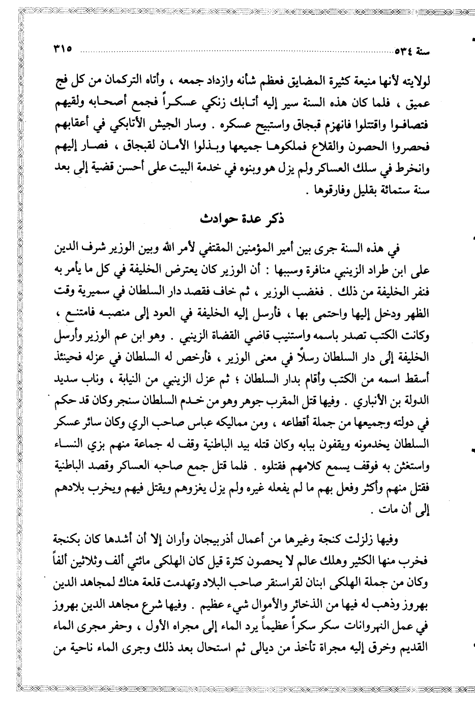 وفيها شرع مجاهد الدين بهروز في عمل النهروانات سكر سكرا عظيما سرد الماء إلى مجراه الأول وحفر مجرى الماء القديم وخرق إليه مجراة تأخذ من ديالى ثم استحال بعد ذلك وجرى الماء ناحية من