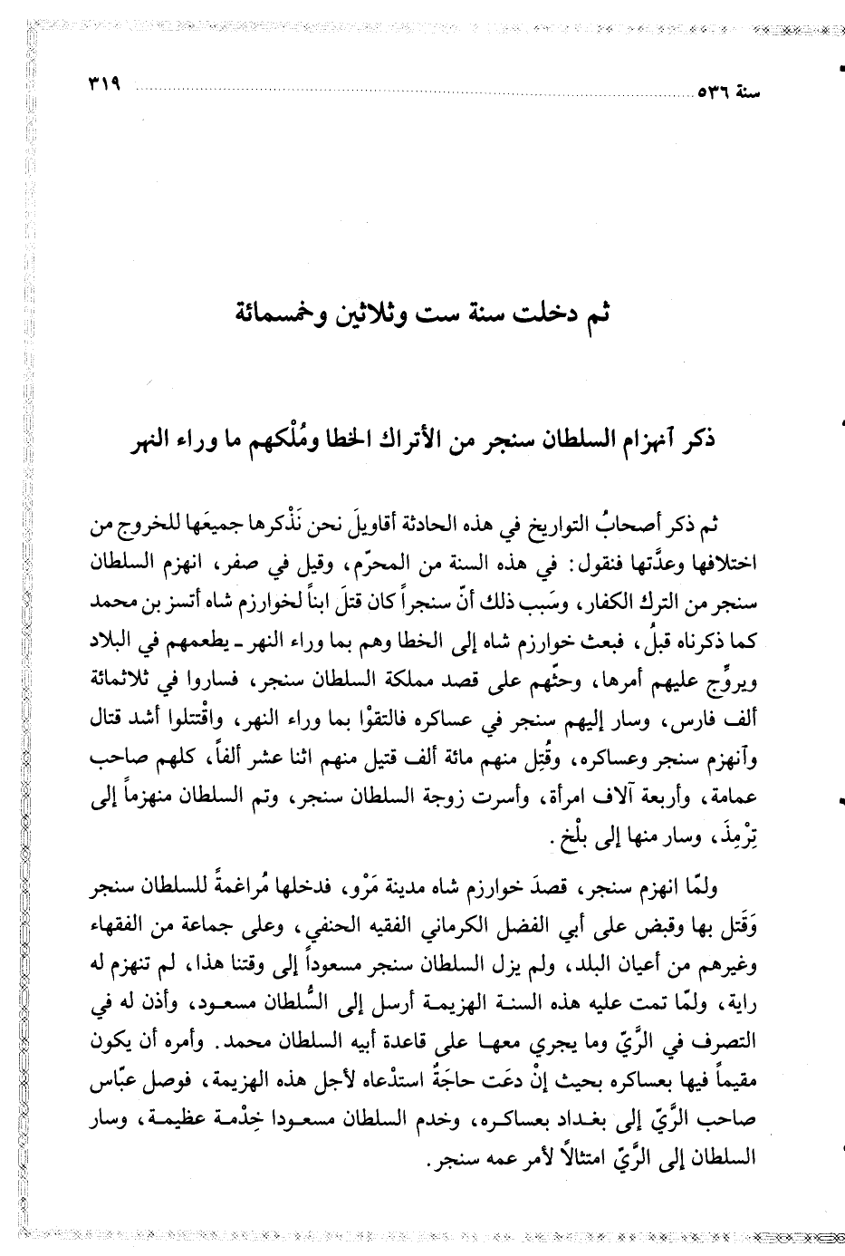 ثم ذكر أصحاب التواريخ في هذه الحادثة أقاويل نحن نذكرها جميعها للخروج من اختلافها وعدتها فنقول في هذه السنة من المحرم وقيل في صفر انهزام السلطان سنجر من الترك الكفار وسبب ذلك أن سنجرا كان قتل ابنا لخوارزم شاه أتسز بن محمد كما ذكرناه قبل فبعث خوارزم شاه إلى الخطا وهم بما وراء النهر يطعمهم في البلاد ويروج عليهم أمرها وحثهم على قصد مملكة السلطان سنجر فساروا في ثلاثمائة ألف فارس وسار إليهم سنجر في عساكره فالتقوا بما وراء النهر واقتتلوا أشد قتال وانهزم سنجر وعساكره وقتل منهم مائة ألف قتيل منهم اثنا عشر ألفا كلهم صاحب عمامة وأربعة آلاف امرأة وأسرت زوجة السلطان سنجر وتم السلطان منهزما إلى ترمذ وسار منها إلى بلخ ولما انهزم سنجر قصد خوارزم شاه مدينة مرو فدخلها مراغمة للسلطان سنجر وقتل بها وقبض على أبي الفضل الكرماني الفقيه الحنفي وعلى جماعة من الفقهاء مغيرهم من أعيان البلد ولم يزل السلطان سنجر مسعودا إلى وقتنا هذا لم تنهزم له راية ولما تمت عليه هذه السنة الهزيمة أرسل إلى السلطان مسعود أذن له في التصرف في الري وما يجري معها على قاعدة أبيه السلطان محمد