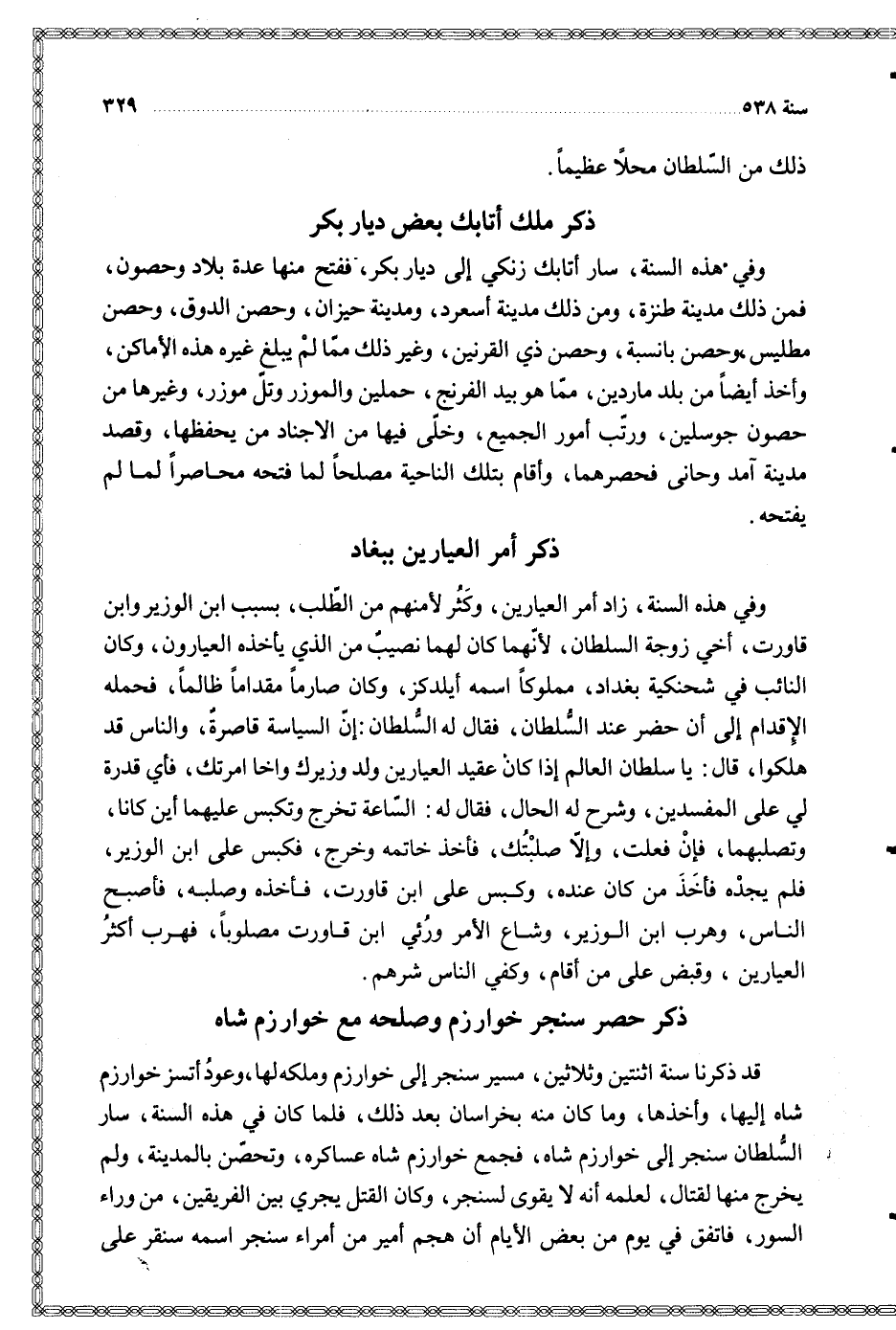 قد ذكرنا سنة اثنتين وثلاثين مسير سنجر إلى خوارزم وملكه لها وعود أتسز خوارزم شاه إليها وأخذها وما كان منه بخراسان بعد ذلك فلما كان في هذه السنة سار السلطان سنجر إلى خوارزم شاه فجمع خوارزم شاه عساكره وتحصن بالمدينة ولم يخرج منها لقتال لعلمه أنه لا يقوى لسنجر وكان القتل يجري بين الفريقين من وراء السور فاتفق في يوم من بعض الأيام أن هجم أمير من أمراء سنجر اسمه سنقر على