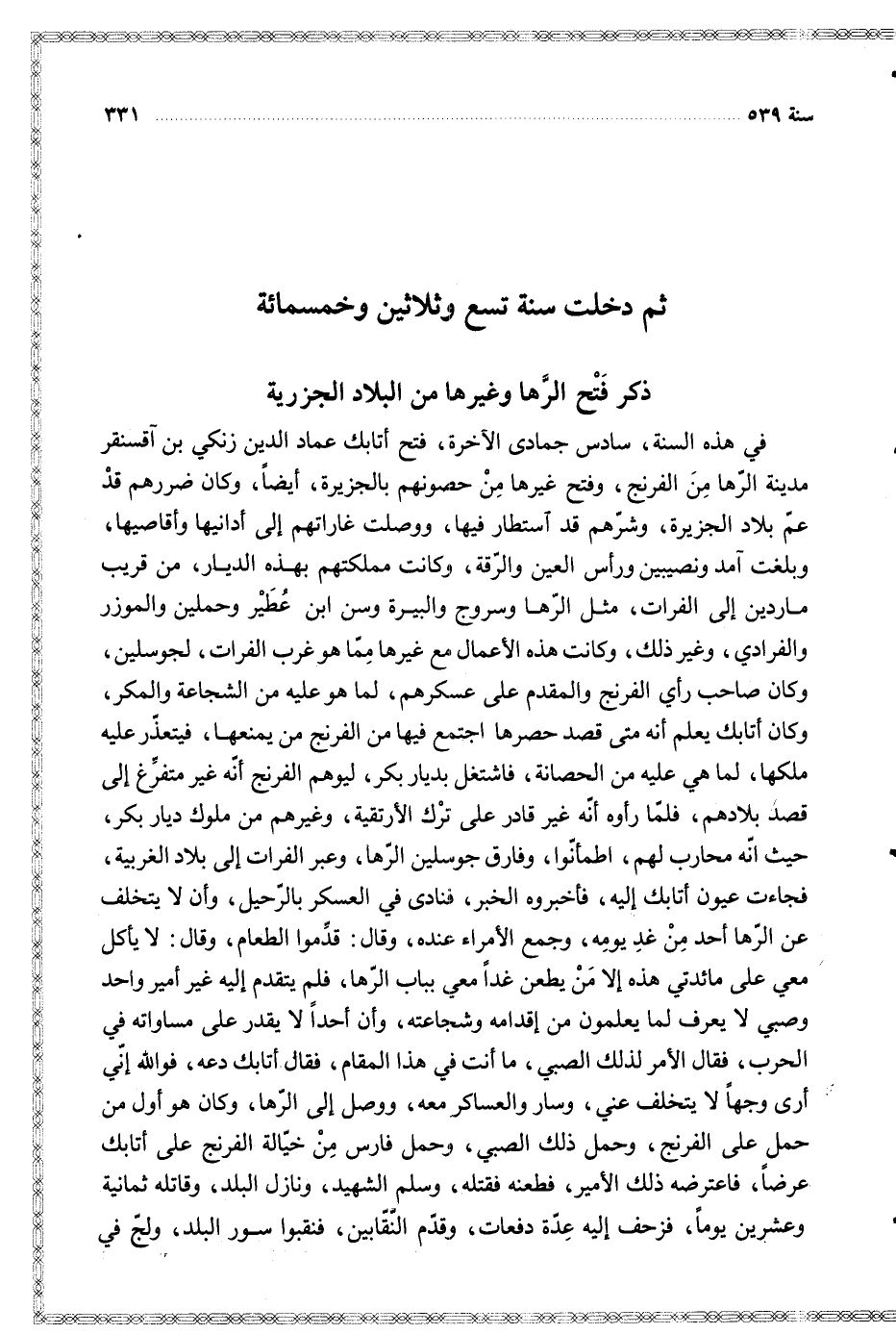 في هذه السنة سادس جمادى الآخرة فتح أتابك عماد الدين زنكي بن آقسنقر مدينة الرها من الفرنج وفتح غيرها من حصونهم بالجزيرة أيضا وكان ضررهم قد عم بلاد الجزيرة وشرهم قد استطار فيها ووصلت غاراتهم إلى أدانيها وأقاصيها وبلغت آمد ونصيبين ورأس العين والرقة وكانت مملكتهم بهذه الديار من قريب ماردين إلى الفرات مثل الرها وسروج والبيرة وسن ابن عطير وحملين والموزر والفرادي وغير ذلك وكانت هذه الأعمال مع غيرها مما هو غرب الفرات لجوسلين وكان صاحب رأي الفرنج والمقدم على عسكرهم لما هو عليه من الشجاعة والمكر وكان أتابك يعلم أنه متى قصد حصرها اجتمع فيها من الفرنج ما يمنعها فيتعذر عليه ملكها لما هب عليه من الحصانة فاشتغل بديار بكر ليوهم الفرنج أنه غير متفرغ إلى قصد بلادهم فلما رأوه أنه غير قادر على ترك الأرتقية وغيرهم من ملوك ديار بكر حيث أنه محارب لهم اطمأنوا وفارق جوسلين الرها وعبر الفرات إلى بلاد الغربية فجاءت عية ن أتابك إليه فأخبروه الخبر فنادى في العسكر بالرحيل وأن لا يتخلف عن الرها أحد من غد يومه وجمع الأمراء عنده وقال قدموا الطعام وقال لا يأكل معي على مائدتي هذه إلا من يطعن غدا معي بباب الرها فلم يتقدم إليه غير أمير واحد وصبي لا يعرف لما يعلمون من إقدامه وشجاعته وأن أحدا لا يقدر على مساواته في الحرب فقال الأمر لذلك الصبي ما أنت في هذا المقام فقال أتابك دعه فوالله إني أرى وجها لا يتخلف عني وسار والعساكر معه ووصل إلى الرها وكان هو أول من حمل على الفرنج وحمل ذلك الصبي وحمل فارس من خيالة الفرنج على أتابك عرضا فاعترضه ذلك الأمير فطعنه فقتله وسلم الشهيد ونازل البلد وقاتله ثمانية وعشرين يوما فزحف إليه عدة دفعات وقدم النقابين فنقبوا سور البلد ولج في