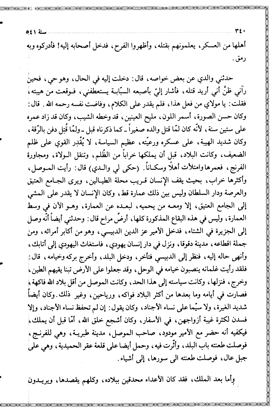 حكى لي والدي قال رأيت الموصل وأكثرها خراب بحيث يقف الإنسان قريب محلة الطيالين ويرى الجامع العتيق والعرصة ودار السلطان وليس بين ذلك عمارة قط وكان الإنسان لا يقدر على المشي إلى الجامع العتيق إلا ومعه من يحميه لبعده عن العمارة وهو الآن في وسط العمارة وليس في هذه البقاع المذكورة كلها أرض مراح قال وحدثني أيضا أنه وصل إلى الجزيرة في الشتاء فدخل الأمير عز الدين الدبيسي وهو من أكابر أمرائه ونم جملة اقطاعه مدينة دقوقا ونزل في دار إنسان يهودي فاستغاث اليهودي إلى أتابك وأنهى حاله إليه فنظر إلى الدبيسي فتأخر ودخل البلد وأخرج بركه وخيامه قال فلقد رأيت غلمانه ينصبون خيامه في الوحل وقد جعلوا على الأرض تبنا يقيهم الطين وخرج فنزلها وكانت سياسته إلى هذا الحد وكانت الموصل من أقل بلاد الله فاكهة فصارت فلي أيامه وما بعدها من أكثر البلاد فواكه ورياحين وغير ذلك