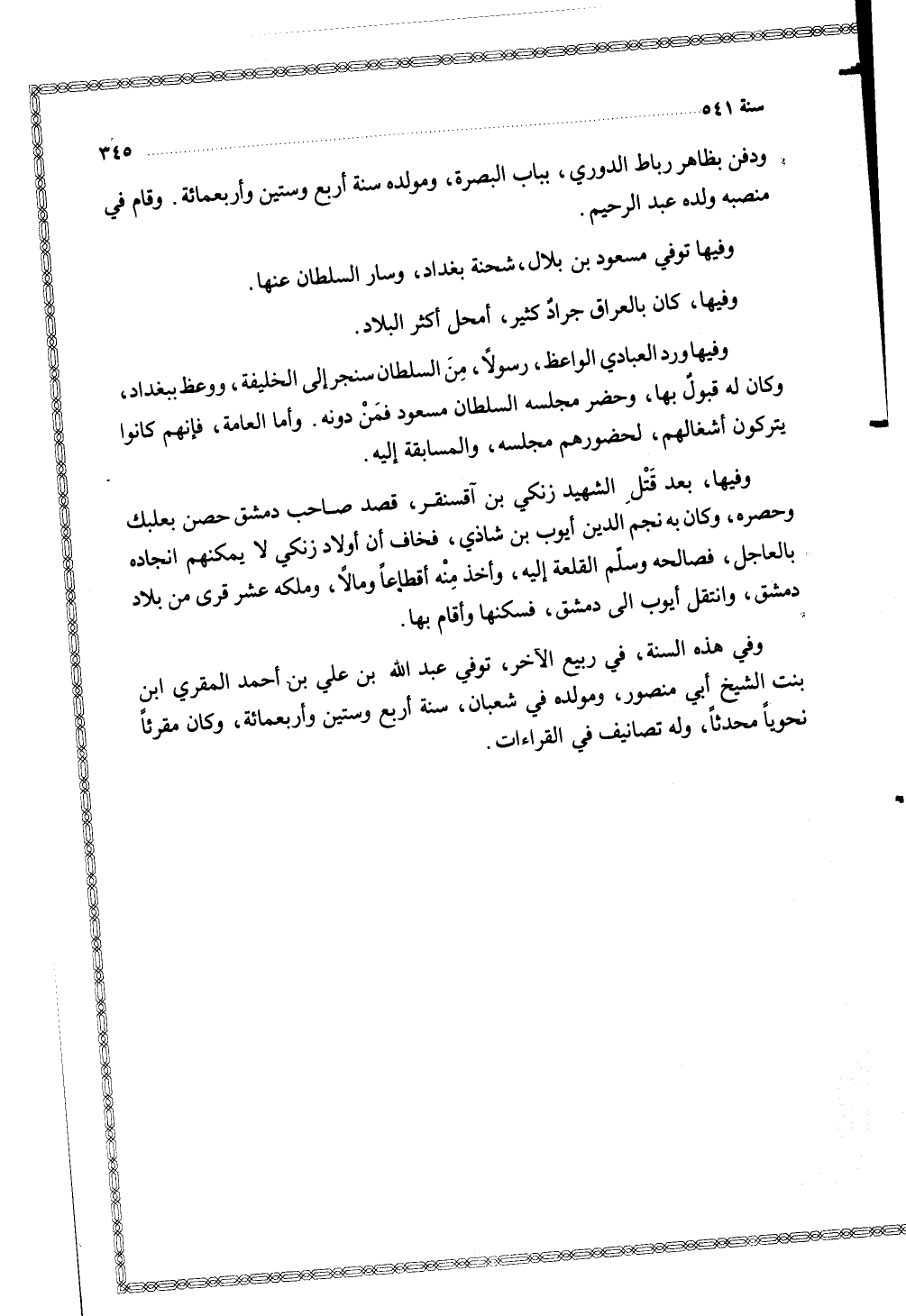 وفي هذه السنة في ربيع الآخر توفي عبد الله بن علي بن أحمد المقري ابن بنت الشيخ أبي منصور ومولده في شعبان سنة أربع وستين وأربعمائة وكان مقرئا نحويا محدثا وله تصانيف في القراءات