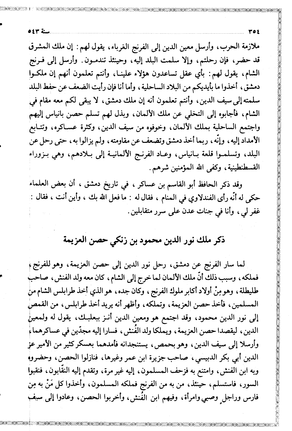 ملازمة الحرب وأرسل معين الدين إلى الفرنج الغرباء يقول لهم إن ملك المشرق قد حضر فإن رحلتم وإلا سلمت البلد إليه وحينئذ تندمون