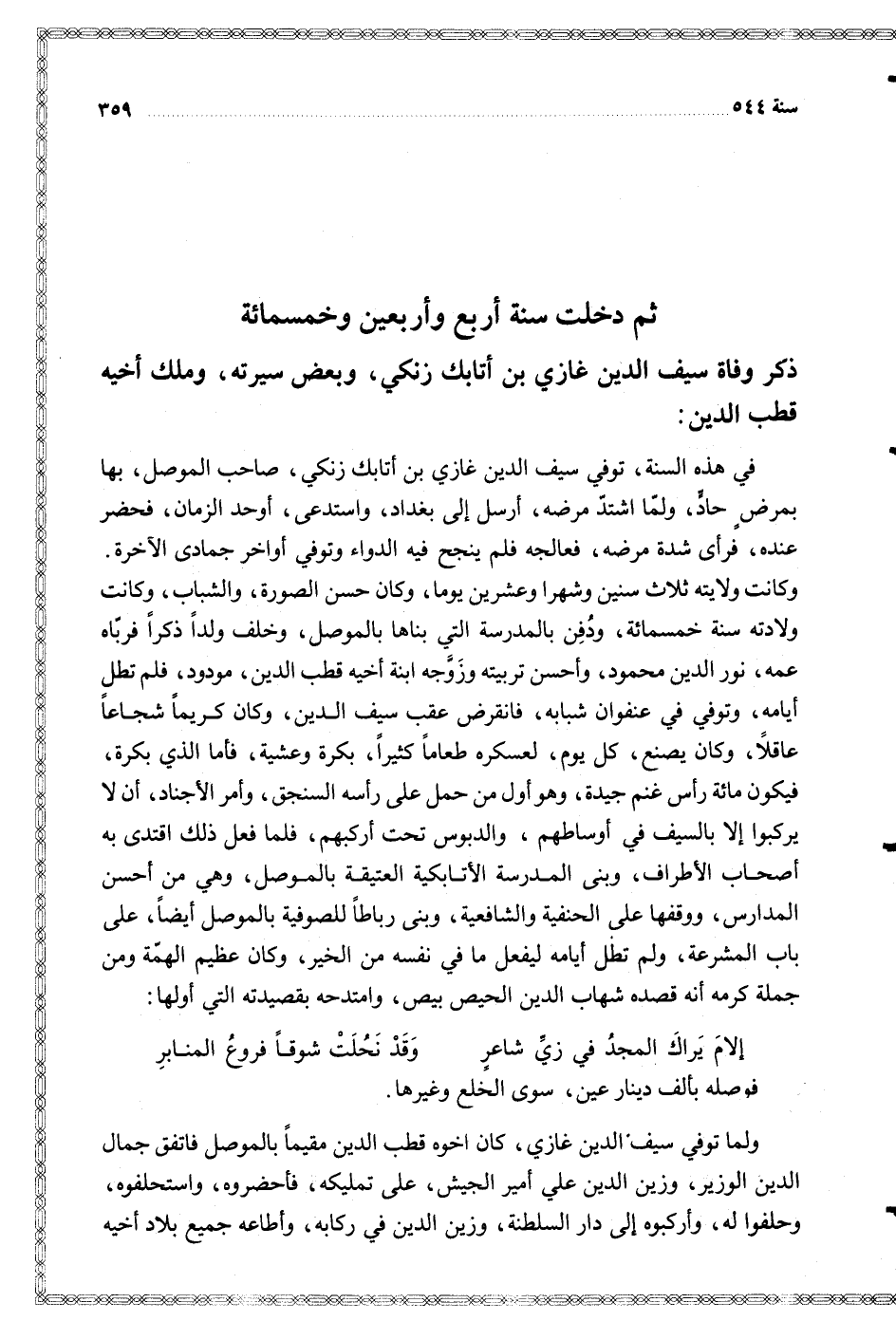وكانت ولايته ثلاث سنين وشهرا وعشرين يوما وكان حسن الصورة والشباب وكانت ولادته سنة خمسمائة ودفن بالمدرسة التي بناها بالموصل وخلف ولدا ذكرا فرباه عمه نور الدين محمود وأحسن تربيته وزوجه ابنة أخيه قطب الدين مودود فلم تطل أيامه وتوفي في عنفوان شبابه فانقرض عقب سيف الدين وكان كريما شجاعا عاقلا وكان يصنع كل يوم لعسكره طعاما كثيرا بكرة وعشية فأما الذي بكرة فيكون مائة رأس غنم جيدة وهو أول من حمل على رأسه السنجق وأمر الأجناد أن لا يركبوا إلا بالسيف في أوساطهم والدبوس تحت أركبهم فلما فعل ذلك اقتدى به أصحاب الأطراف وبنى المدرسة الأتابكية العتيقة بالموصل وهي من أحسن المدارس ووقفها على الحنفية والشافعية وبنى رباطا للصوفية بالموصل أيضا على باب المشرعة ولم تطل أيامه ليفعل ما في نفسه من الخير وكان عظيم الهمة ومن جملة كرمه أنه قصده شهاب الدين الحيص بيص وامتدحه بقصيدته التي أولها