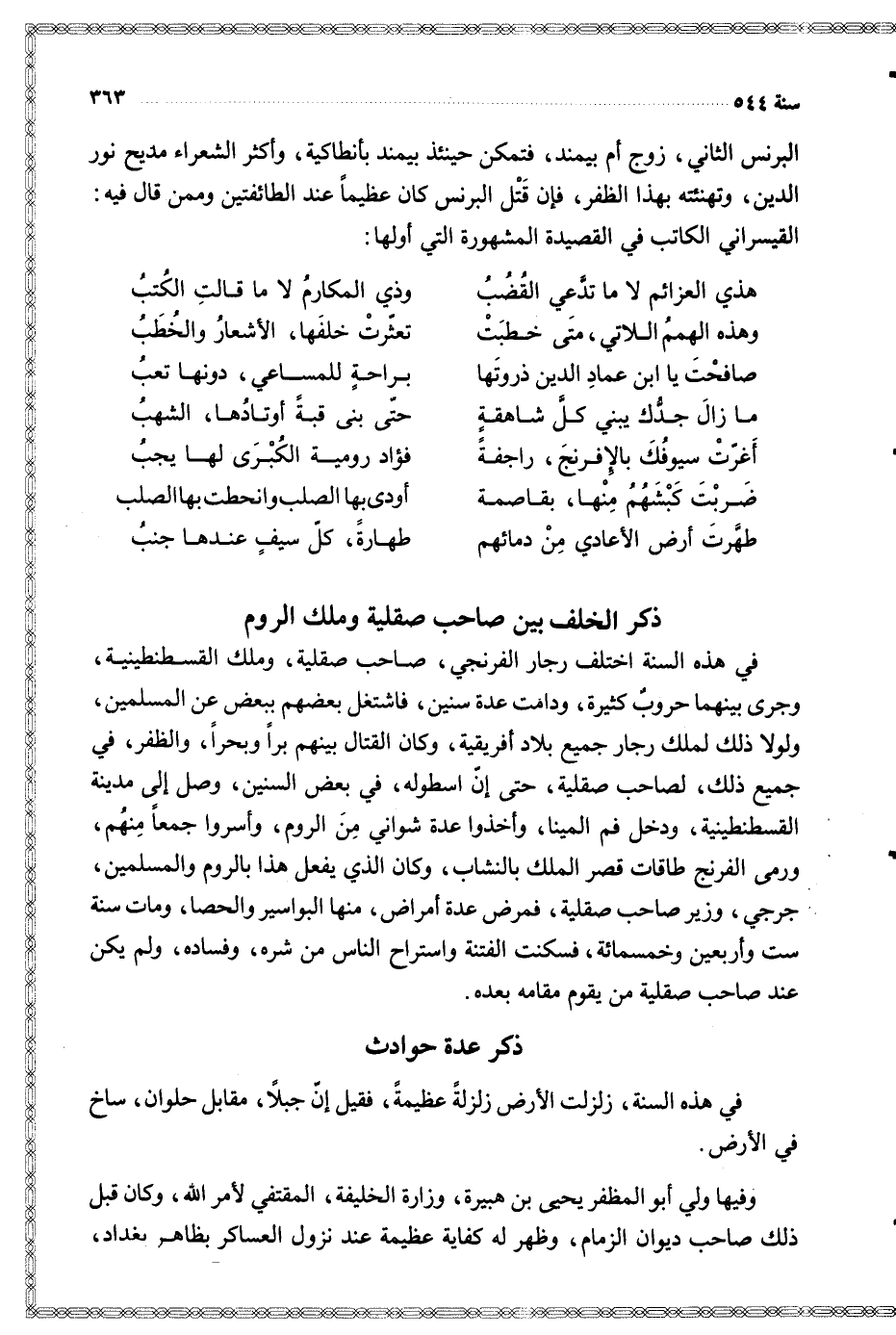 في هذه السنة اختلف رجار الفرنجي صاحب صقلية وملك القسطنطينية وجرى بينهما حروب كثيرة ودامت عدة سنين فاشتغل بعضهم ببعض عن المسلمين ولولا ذلك لملك رجار جميع بلاد أفريقية وكان القتال بينهم برا وبحرا والظفر في جميع ذلك لصاحب صقلية حتى إن اسطوله في بعض السنين وصل إلى مدينة القسطنطينية ودخل فم المينا وأخذوا عدة شواني من الروم وأسروا جمعا منهم ورمى الفرنج طاقات قصر الملك بالنشاب وكان الذي يفعل هذا بالروم والمسلمين جرجي وزير صاحب صقلية فمرض عدة أمراض منها البواسير والحصا ومات سنة ست وأربعين وخمسمائة فسكنت الفتنة واستراح الناس من شره وفساده ولم يكن عند صاحب صقلية من يقوم مقامه بعده