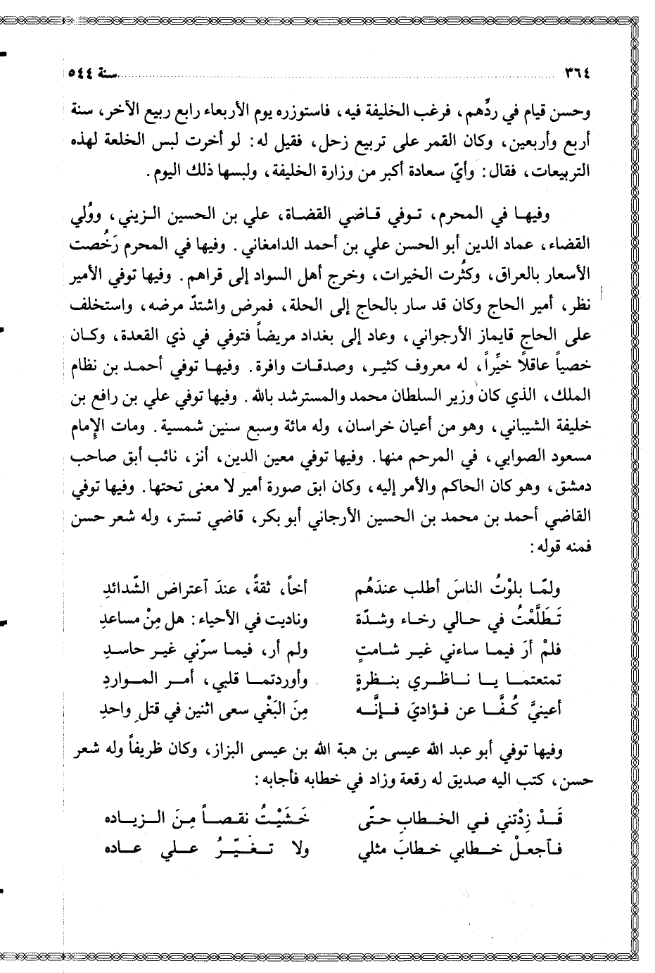 وفيها توفي القاضي أحمد بن محمد بن الحسين الأرجاني أبو بكر قاضي تستر وله شعر حسن فمنه قوله