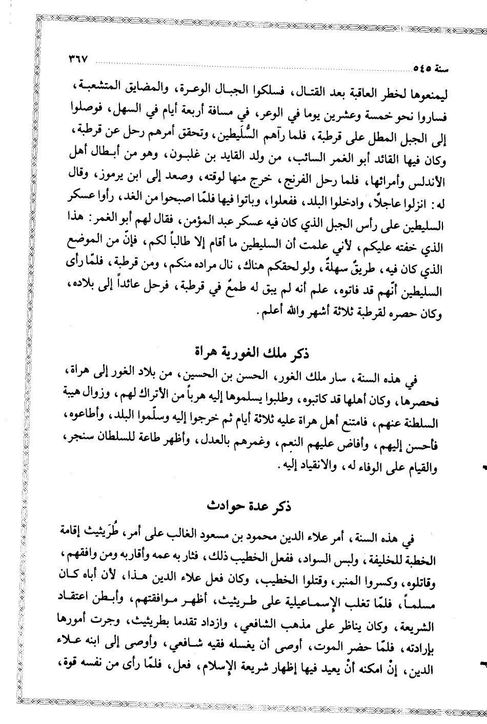 في هذه السنة سار ملك الغور الحسن بن الحسين وكان أهلها قد كاتبوه وطلبوا تسليمها إليه هربا من الأتراك لهم وزوال هيبة السلطنة عنهم فامتنع أهل هراة عليه ثلاثة أيام ثم خرجوا إليه وسلموا البلد وأطاعوه فأحسن إليهم وأفاض عليهم النعم وغمرهم بالعدل وأظهر طاعة للسلطان سنجر والقيام على الوفاء له والانقياد إليه