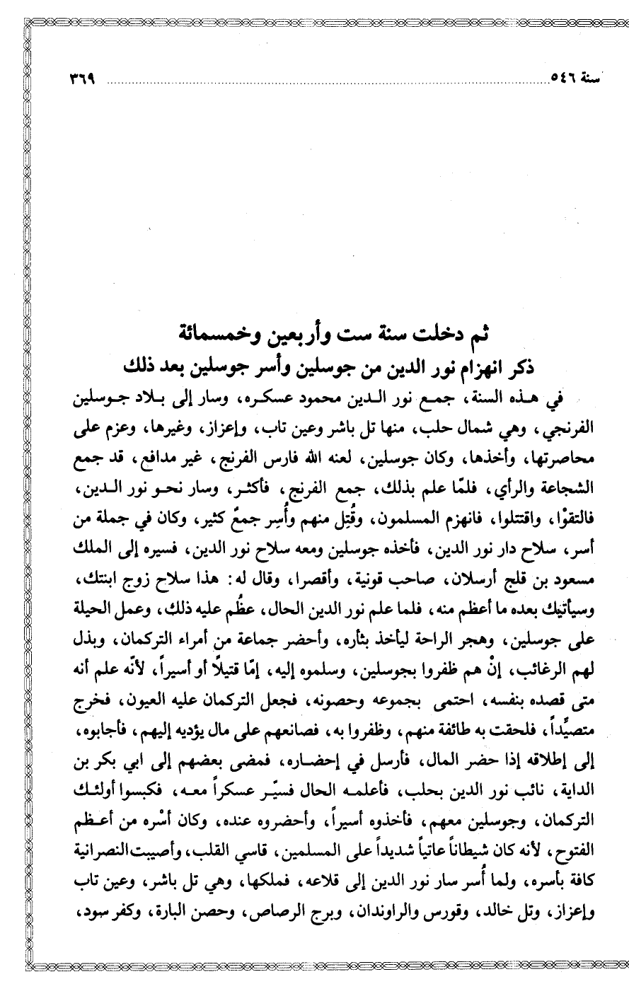 في هذه السنة جمع نور الدين محمود عسكره وسار إلى بلاد جوسلين الفرنجي وهي شمال حلب منها تل باشر وعين تاب وإعزاز وغيرها وعزم على محاصرتها وأخذها وكان جوسلين لعنه الله فارس الفرنج غير مدافع قد جمع الشجاعة والرأي فلما علم بذلك جمع الفرنج فأكثر وسار نحو نور الدين فالتقوا واقتتلوا فانهزم المسلمون وقتل منهم وأسر جمع كثير وكان في جملة من أسر سلاح دار نور الدين فأخذه جوسلين ومعه سلاح نور الدين فسيره إلى الملك مسعود بن قلج أرسلان صاحب قونية واقصرا وقال له هذا سلاح زوج ابنتك وسيأتيك بعده ما أعظم منه فلما علم نور الدين الحال عظم عليه ذلك وعمل الحيلة على جوسلين وهجر الراحة ليأخذ بثأره وأحضر جماعة من أمراء التركمان وبذل لهم الرغائب إن هم ظفروا بجوسلين وسلموه إليه إما قتيلا أو أسيرا لأنه علم أنه متى قصده بنفسه احتمى بجموعه وحصونه فجعل التركمان عليه العيون فخرج متصيدا فلحقت به طائفة منهم وظفروا به فصانعهم على مال يؤديه إليهم فأجابوه إلى إطلاقه إذا حضر المال فأرسل في إحضاره فمضى بعضهم إلى أبي بكر بن الداية نائب نور الدين بحلب فأعلمه الحال فسير عسكرا معه فكبسوا أولئك التركمان وجوسلين معهم فأخذوه أسيرا وأحضروه عنده وكان أسره من أعظم الفتوح لأنه كان شيطانا عاتيا شديدا على المسلمين قاسي القلب وأصيبت النصرانية كافة بأسره ولما أسر سار نور الدين إلى قلاعه فملكها وهي تل باشر وعين تاب وإعزاز وتل خالد وقورس والراوندان وبرج الرصاص وحصن البارة وكفر سود