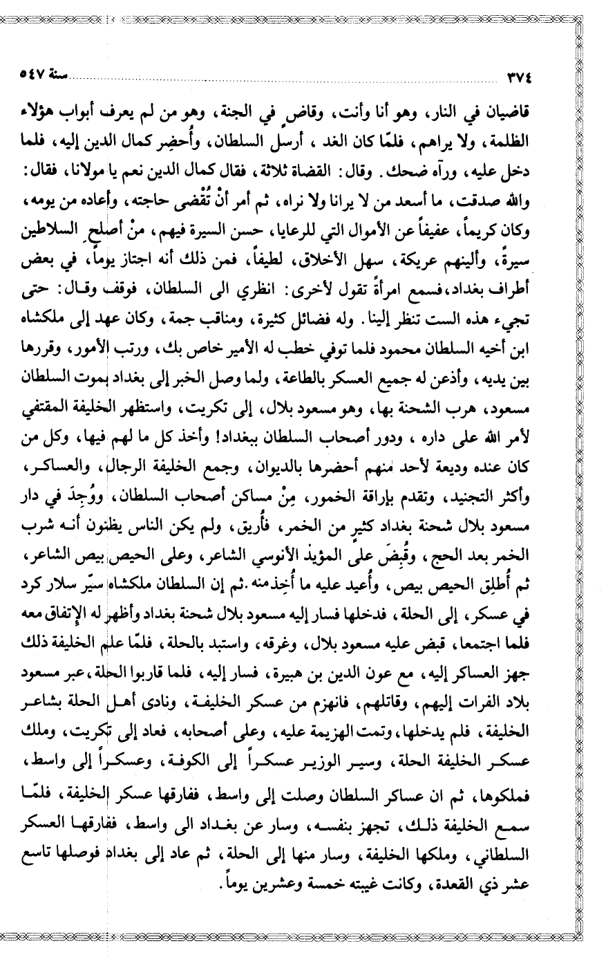 وقال القضاة ثلاثة فقال كمال الدين نعم يا مولانا فقال والله صدقت ما أسعد من لا يرانا ولا نراه ثم أمر أن تقضى حاجته وأعاده من يومه وكان كريما عفيفا عن الأموال التي للرعايا حسن السيرة فيهم من أصلح السلاطين سيرة وألينهم عريكة سهل الأخلاق لطيفا فمن ذلك أنه اجتاز يوما في بعض أطراف بغداد فسمع امرأة تقول لأخرى انظري إلى السلطان فوقف وقال حتى تجيء هذه الست تنظر إلينا