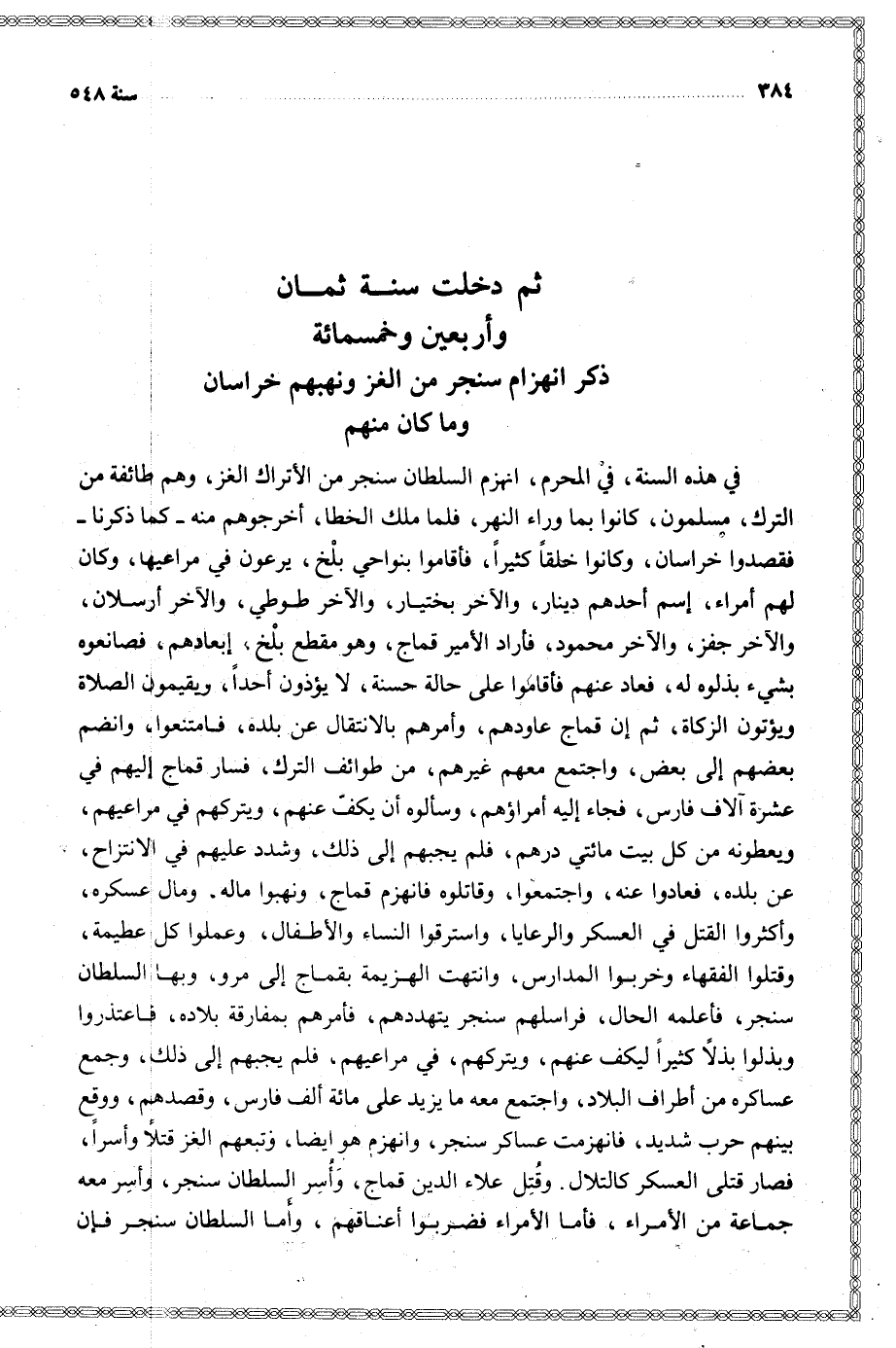 في هذه السنة في المحرم انهزم السلطان من الأتراك الغز وهم طائفة من الترك مسلمون كانوا بما وراء النهر فلما ملك الخطا أخرجوهم منه كما ذكرنا فقصدوا خراسان وكانوا خلقا كثيرا فأقاموا بنواحي بلخ يرعون في مراعيها وكان لهم أمراء إسم أحدهم دينار والآخر بختيار والآخر طوطي والآخر أرسلان والآخر جفز والآخر محمود فأراد الأمير قماج وهو مقطع بلخ إبعادهم فصانعوه بشيء بذلوه له فعاد عنهم فأقاموا على حالة حسنة لا يؤذون أحدا ويقيمون الصلاة ويؤتون الزكاة ثم إن قماج عاودهم وأمرهم بالانتقال عن ببلده فامتنعوا وانضم بعضهم إلى بعض واجتمع معهم غيرهم من طوائف الترك فسار قماج إليهم في عشرة آلاف فارس فجاء إليه أمراؤهم وسألوه أن يكف عنهم ويتركهم في مراعيهم ويعطونه من كل بيت مائتي درهم فلم يجبهم إلى ذلك وشدد عليهم في الانتزاح عن بلده فعادوا عنه واجتمعوا وقاتلوه فانهزم قماج ونهبوا ماله ومال عسكره وأكثروا القتل في العسكر والرعايا واسترقوا النساء والأطفال وعملوا كل عظيمة وقتلوا الفقهاء وخربوا المدارس وانتهت الهزيمة بقماج إلى مرو وبها السلطان سنجر فأعلمه الحال فراسلهم سنجر يتهددهم فأمرهم بمفارقة بلاده فاعتذروا وبذلوا بذلا كثيرا ليكف عنهم ويتركهم في مراعيهم فلم يجبهم إلى ذلك وجمع عساكره من أطراف البلاد واجتمع معه ما يزيد على مائة ألف فارس وقصدهم ووقع بينهم حرب شديد فانهزمت عساكر سنجر وانهزم هو أيضا وتبعهم الغز قتلا وأسرا فصار قتلى العسكر كالتلال